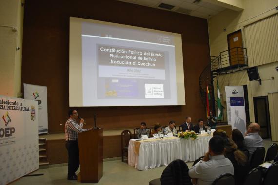 Con el apoyo del OEP se realizó, el viernes 11 de mayo del 2018, una presentación de la traducción de la constitución política a los tres idiomas originarios más hablados del país: quechua, aymara y guaraní. Hasta ahora ya se realizaron presentaciones de la constitución traducida en las ciudades de La Paz, Sucre y Oruro.
