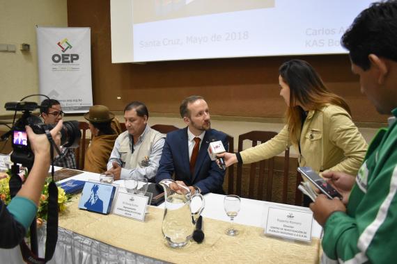Además estuvieron presentes varios medios de comunicación que realizaron entrevistas tanto al representante de la KAS Bolivia como a las autoridades del Órgano Electoral Plurinacional.