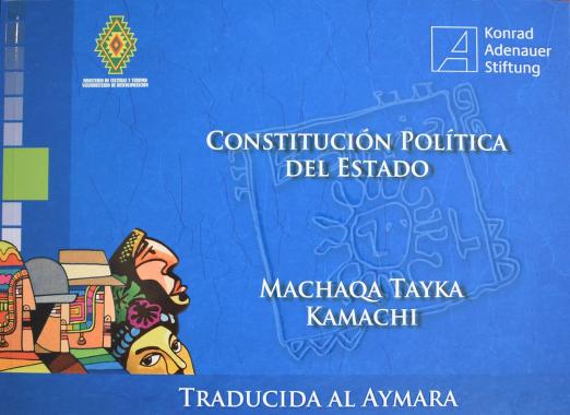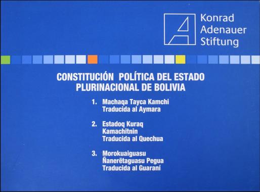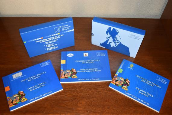 La Fundación Konrad Adenauer tradujo la Constitución Política del Estado Plurinacional de Bolivia a tres idiomas, los cuales abarcan más del 80% de la población indígena. Con esta traducción a los idiomas indígenas más importantes como el Aymara, Quechua y Guaraní, la fundación contribuye a la democracia participativa, a la educación política de gran parte de la población y a la revaloración de los idiomas nativos de los pueblos indígenas. Desde el año 2008 la fundación Konrad Adenauer está traduciendo la constitución política para posibilitar y facilitar a la mayoría de los bolivianos posibles el acceso a los textos oficiales del Estado. Pese al reconocimiento oficial de los idiomas indígenas, la mayoría de las actividades del Estado se documentan solamente en el idioma español.