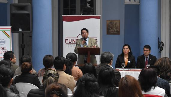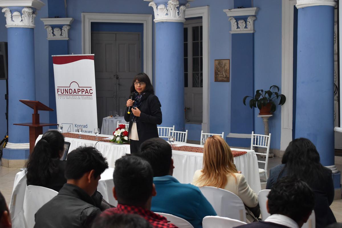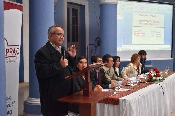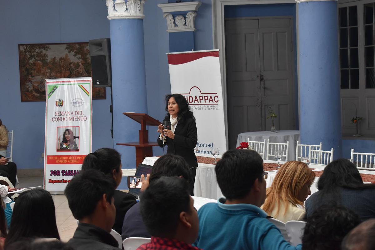 La senadora Dra. Mirtha Arce Camacho de Unidad Demócrata UD y el Director de FUNDAPPAC, Juan Pablo Ferrufino, aperturaron el foro. Después la Senadora, así como el secretario departamental de gestión institucional del gobierno autónomo departamental de Tarija, Lic. Rubén Ardaya daron la introducción del tema.