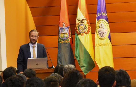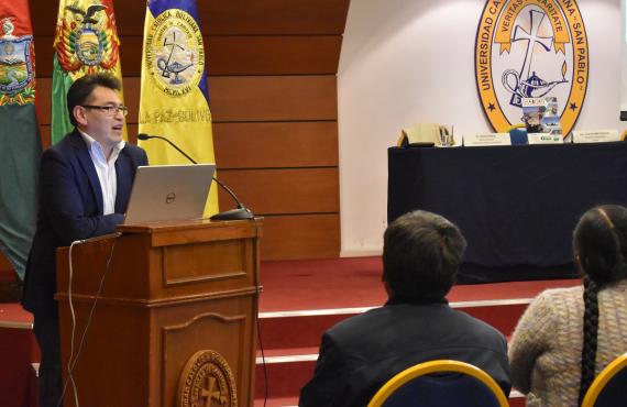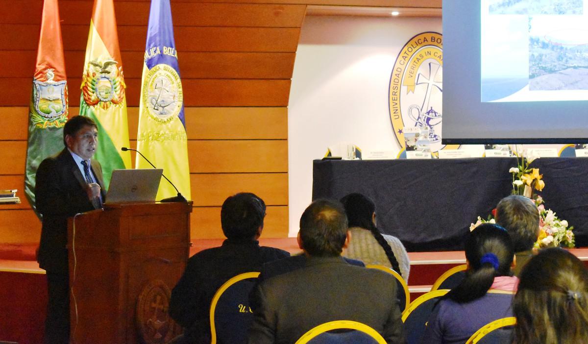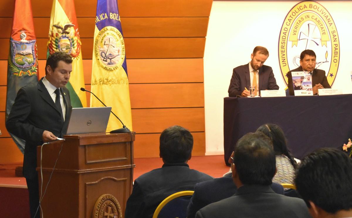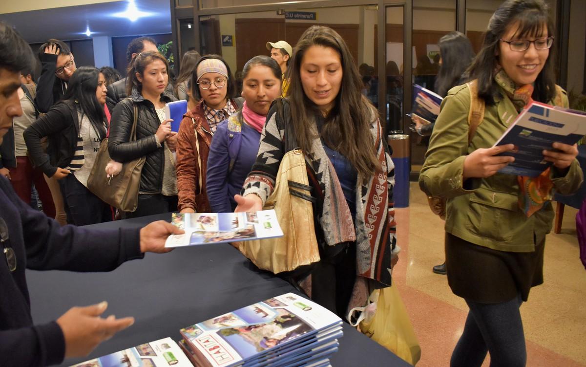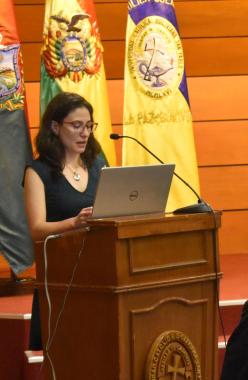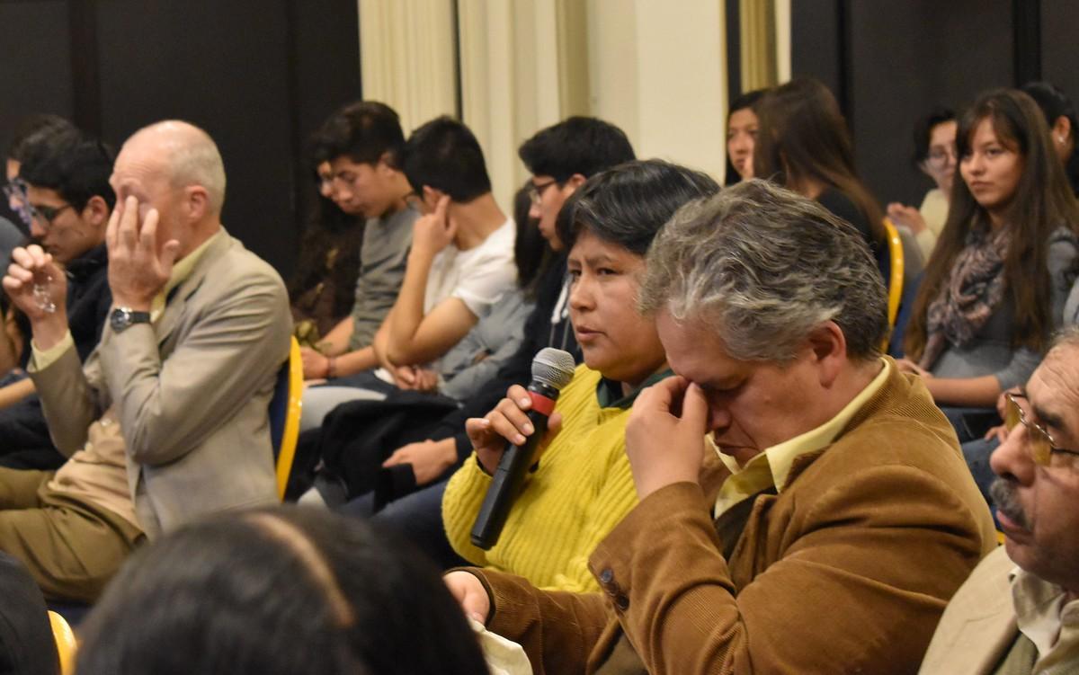 Le presentación se realizó en el paraninfo de la UCB con aproximadamente 100 participantes, entre ellos muchos estudiantes, profesores, y autoridades estatales como la diputada nacional Elisa Catari.