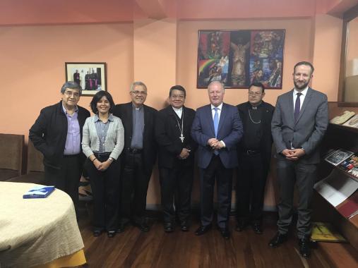 Posteriormente, el representante de la KAS en Bolivia, Dr. Georg Dufner junto con el diputado Weiss, tuvieron un encuentro con el Monseñor Aurelio Pesoa Ribera, Obispo Auxiliar de La Paz y otros representantes de la Conferencia Episcopal Boliviana, en el que conversaron sobre la situación de la iglesia católica en Bolivia y los cambios socioculturales que vive nuestro país.