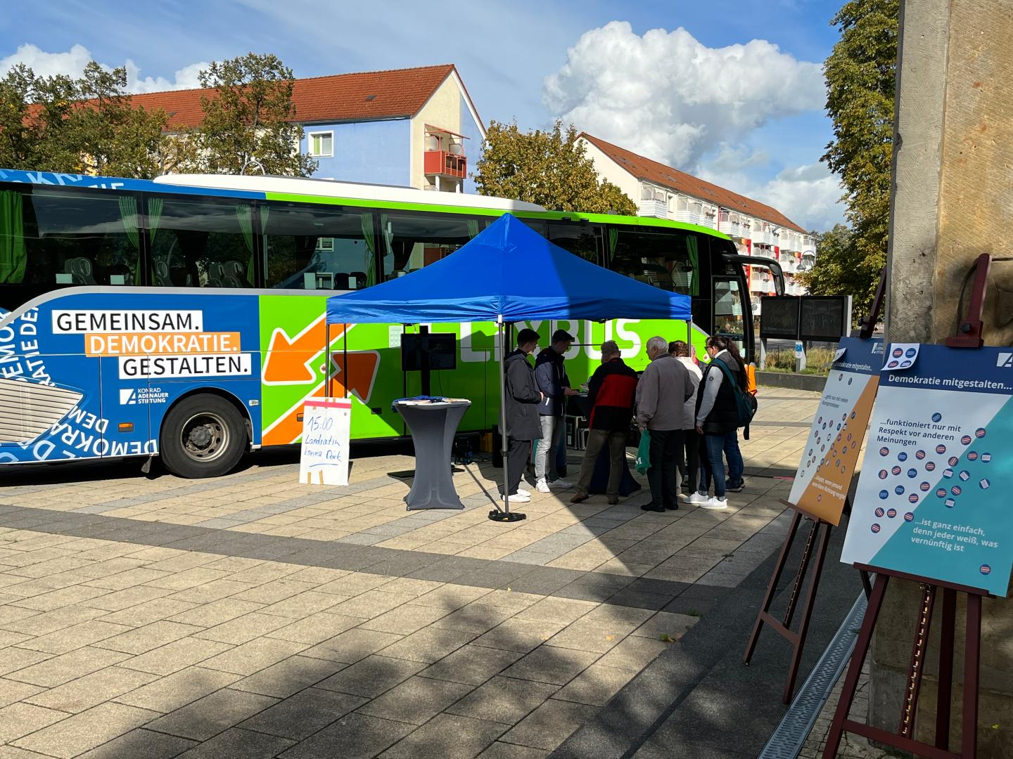 Unter dem Motto “Gemeinsam.Demokratie.Gestalten.” ist die Konrad-Adenauer-Stiftung wieder mit dem Demokratie-Bus unterwegs in Deutschland. Wir laden die Bürgerinnen und Bürger ein, mit uns über die Demokratie, zentrale Werte und die aktuelle Politik ins Gespräch zu kommen.