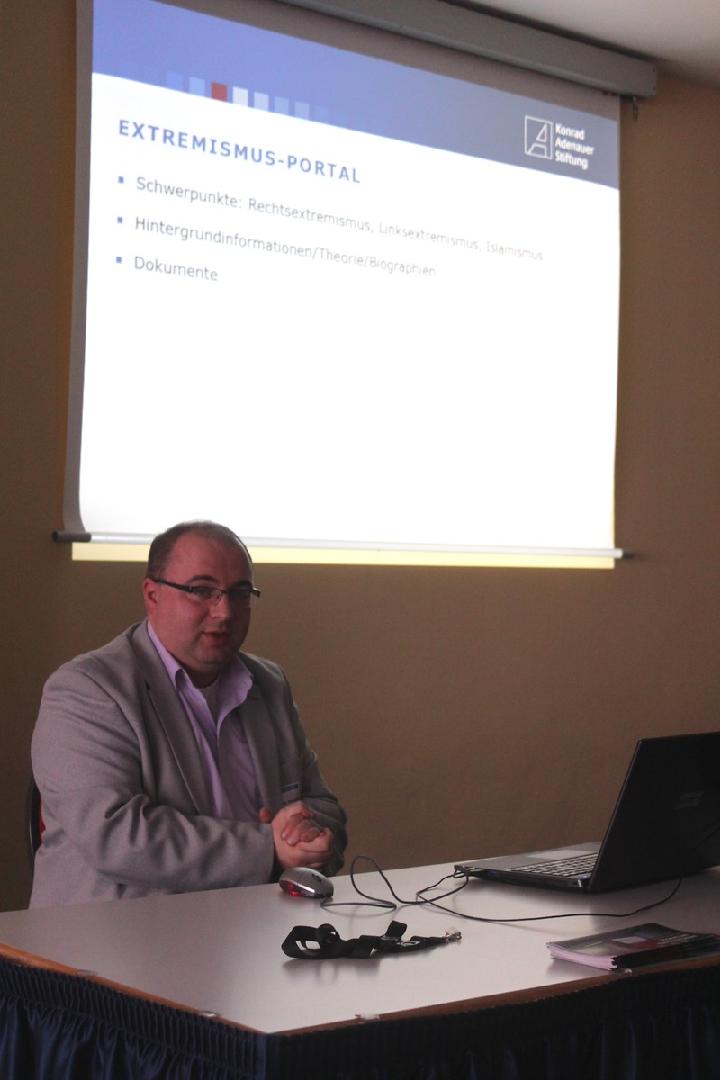 Am zweiten Tag der Messe folgten in zwei Zeitblöcken 46 parallele Projektpräsentationen. In vielen Präsentationen und vor allem auch in Gesprächen standen die Opfer der SED-Diktatur im Zentrum. In der Rubrik „Surfen, Smartphone et al.“ präsentierte Dr. Andreas Schulze vom Politischen Bildungsforum Sachsen-Anhalt das neue Extremismus-Portal der Konrad-Adenauer-Stiftung, das demnächst im Internet verfügbar sein wird. Dieses Portal stößt auf großes Interesse. Angesichts der zunehmenden Polarisierung in der Gesellschaft und der Auseinandersetzungen von Extremisten auf den Straßen ergibt sich ein Bedürfnis nach kritischer Auseinandersetzung mit Rechts- und Linksextremismus sowie mit dem Islamismus.