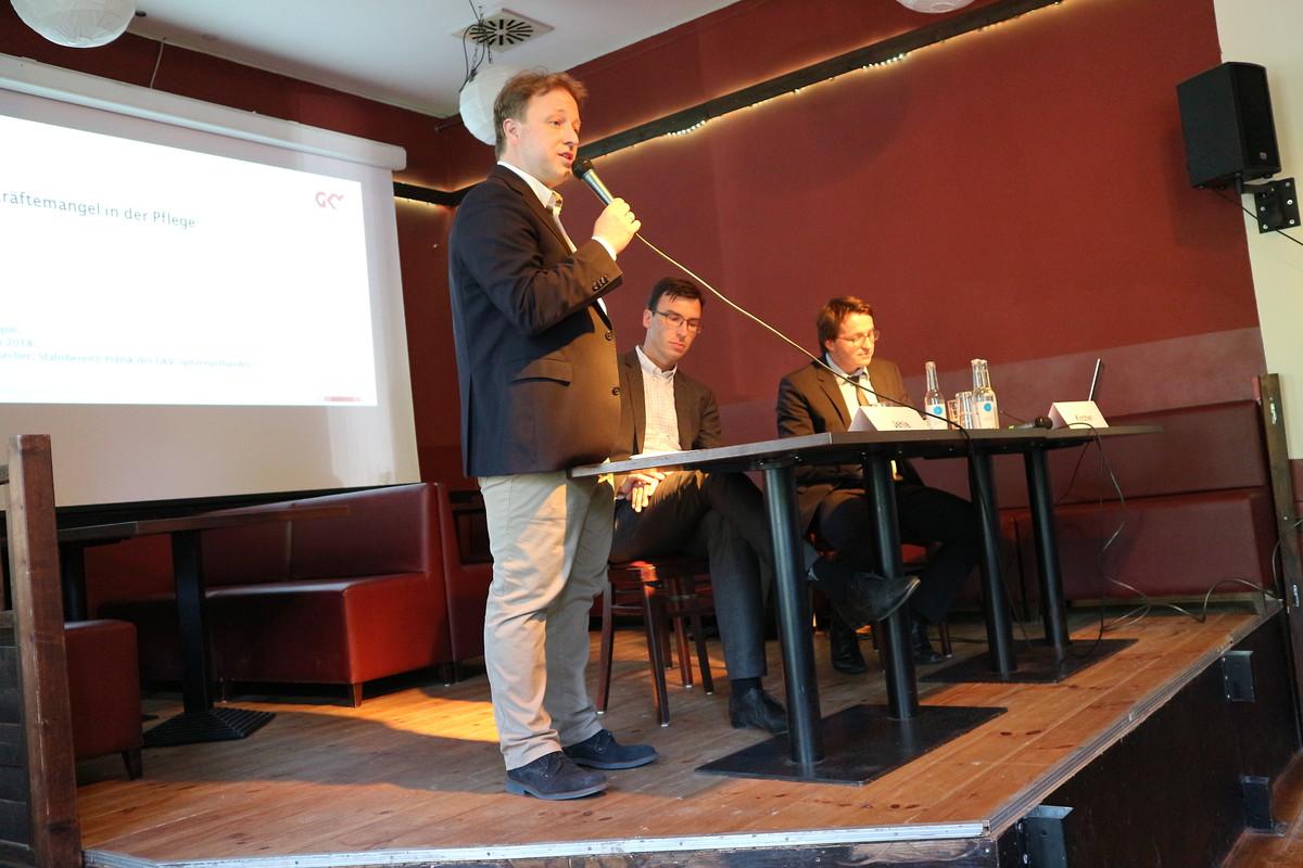 René Kircher wandte sich nachfolgend der politischen Dimension zu. Die Pflege sei in der Vergangenheit stets ein Dauerbrenner gewesen, erst in den vergangenen Jahren drehte sich die Diskussion jedoch fast ausschließlich um den Fachkräftemangel in der Pflege. Spätestens seit dem medienwirksamen Auftritt von Alexander Jorde im Bundestagswahlkampf 2017 sei das Thema Fachkräftemangel in der Pflege der Öffentlichkeit vor Augen geführt worden.