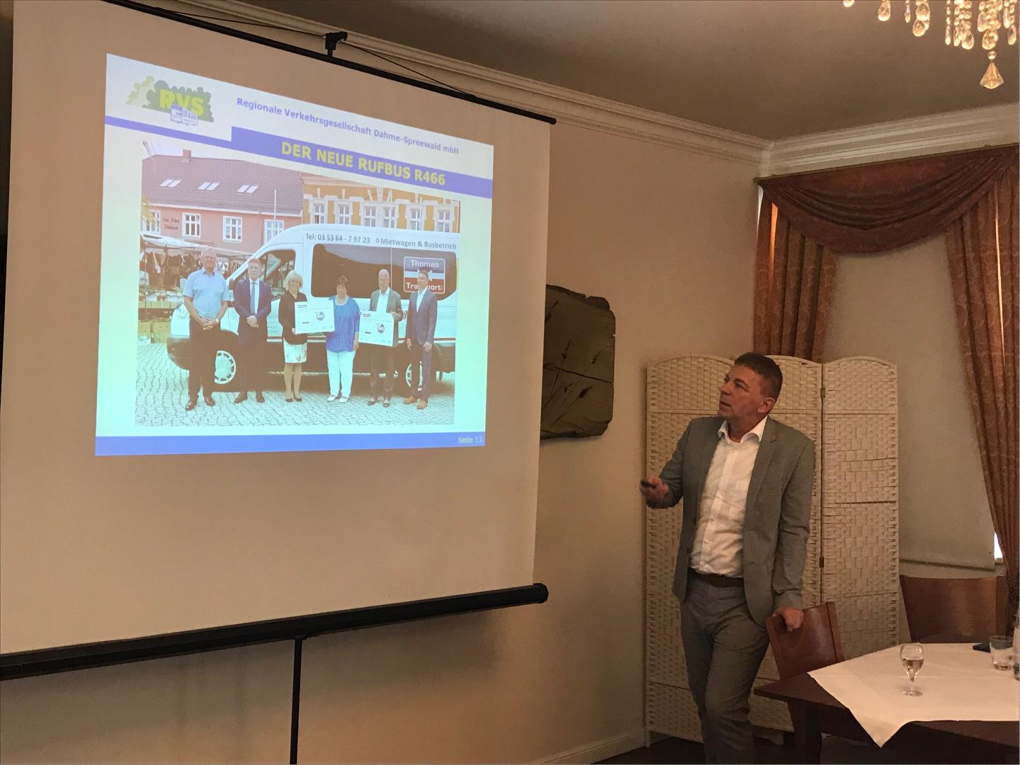Nach der Pause ging es in der zweiten Einheit mit Siegfried Richter, dem Geschäftsführer der regionalen Verkehrsgesellschaft Dahme-Spreewald um Verkehrsanbindung und Mobilität auf dem Lande. Grundprobleme wie der Investitionsstau bei Wartung und Ausbau der Verkehrsinfrastruktur und die Finanzierung kamen zur Sprache. Diskutiert wurde über Erfahrungen mit Ruf-Bussen. Die Verkehrswende stellt die Betriebe vor neue Herausforderungen der Umrüstung zu hohen Kosten. Gesprochen wurde über eine weitergehende Spaltung der Gesellschaft wegen der steigenden Kosten für den Individualverkehr, der dann vielleicht nurmehr von den Wohlhabenden genutzt wird („Volkswagen ade"), über das Abgehängtsein auf dem Lande ohne Auto sowie über die Notwendigkeit sozialer Vergünstigungen im öffentlichen Verkehr für Familien und sozial Bedürftige. Julian Brüning berichtete über den Landesnahverkehrsplan Berlin-Brandenburg, wobei im Gespräch diesbezüglich eine Dominanz Berlins beklagt wurde.