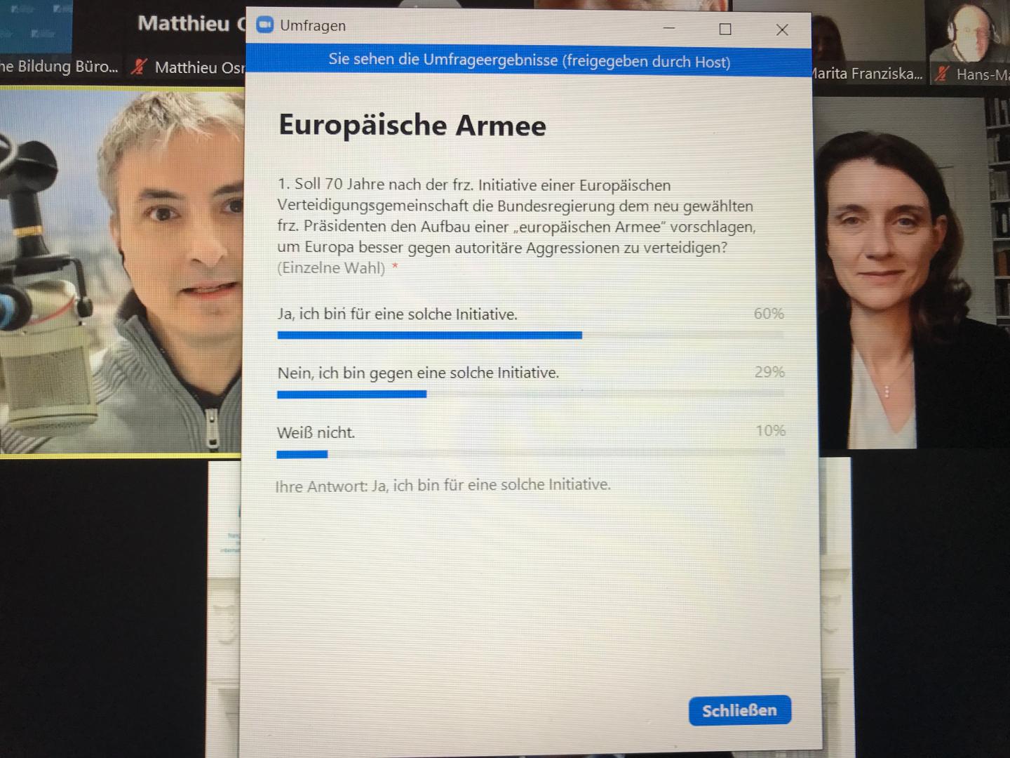 Um der Gefahr einer Enttäuschung über die europäische Antwort auf die russische Aggression zu bannen, müssten realistische Zwischenschritte zu einer höheren Verteidigungsfähigkeit Europas vereinbart werden. Relevante Fortschritte sah Daniela Schwarzer in dem wenige Wochen zuvor veröffentlichten und durch den Krieg in der Ukraine noch einmal deutlich angepassten „Strategischen Kompass“. Er zeige, dass die EU zu einer gemeinsamen Risikoanalyse in der Lage sei und benenne konkret Schritte. Mit den verteidigungspolitischen Vorschlägen wie dem einer schnelle Eingreiftruppe werde auch die Zusammenarbeit im Rahmen der NATO besser. Die Publikumsfrage nach dem Aufbau einer europäischen Armee fiel unter dem deutschen Publikum ewartungsgemäß positiv aus.