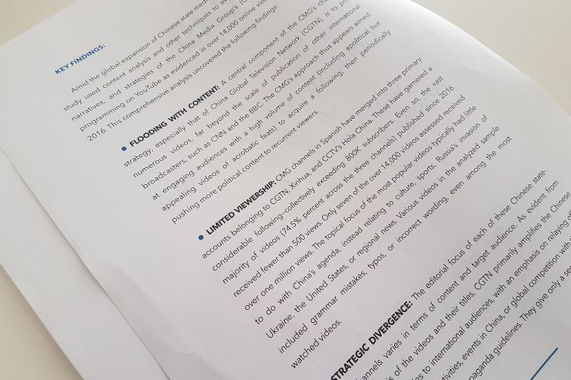 La investigación -que analizó más de 14 000 videos con herramientas de scraping y análisis estadístico- arroja, entre otras conclusiones que los canales de la China Media Group (CMG) en español tienen un limitado alcance e impacto, pero con una tendencia a «la creación de gran volumen de contenidos para atraer al público, incrementar el número de seguidores y defender sutilmente perspectivas políticas». El análisis también «revela casos concretos de desinformación, teorías conspirativas y difusión de noticias falsas, especialmente en relación con COVID-19, a través de CGTN y Xinhua en Español».