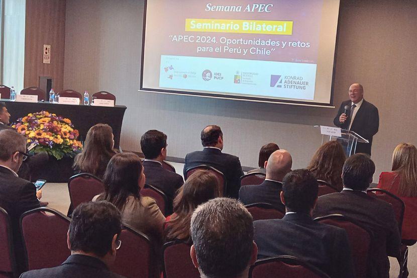 El 7 de noviembre se realizó en Lima el seminario APEC 2024: Oportunidades y Retos para el Perú y Chile, que reunió a representantes del mundo político, académico, privado y diplomático, quienes analizaron las posibilidades de desarrollo que ofrece a sus países el comercio con Asia-Pacífico y una eventual consolidación del hidrógeno verde.