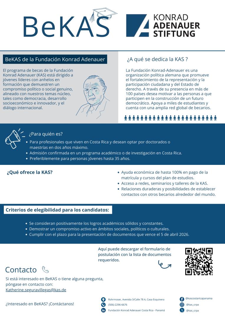 La Fundación Konrad Adenauer (KAS) en Costa Rica-Panamá abre el periodo de becas a estudiantes de programas de maestrías que necesiten apoyo para realizar sus estudios.