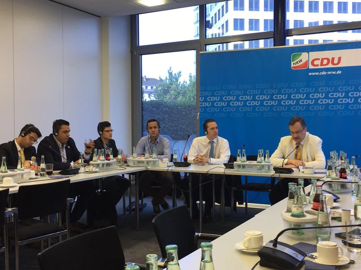 En Dusseldorf hubo varios reuniones destacados. Después de una introducción a la importancia histórica y política del estado de Norterhino Westfalia se presento la estrategia de la CDU en la campana para las recientes elecciones estatales por el jefe de Política y Estrategia Guido Hintze. Tambien tuvimos el honor de ser recibidos por el nuevo presidente del Landtag (Parlamento Estadal) en Düsseldorf, André Kuper. Las experiencias recientes de la campaña electoral y la transición de la fracción de oposicion en poder de gobierno fueron objeto de discusiones con MdL Marco Voge. Después se dio una introducción a la labor educativa de la KAS en las capitales de las provincias y en concreto la ciudad de Bonn (antigua capital de Alemania Occidental) por la Dra. Ulrike Hospes. Asi que tambien hubo una noche informal con el presidente electo en el parlamento de la Junge Unión NRW Florian Braun.