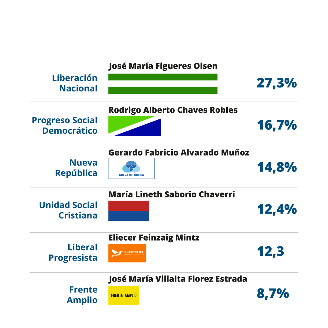 Knapp verpasst hat die zweite Runde der evangelikale Prediger Fabricio Alvarado der Partido Nueva República (PNR), der auf dem dritten Platz landete. Er erhielt besonders in den schwächer entwickelten Küstenregionen starken Zuspruch, konnte sein Ergebnis von 2018 jedoch nicht wiederholen.[4] Als Verliererin der Wahlen gilt die Christdemokratin Lineth Saborío (Partido Unidad Social Cristiana), die bis zuletzt in Umfragen auf dem zweiten Platz hinter Figueres lag.