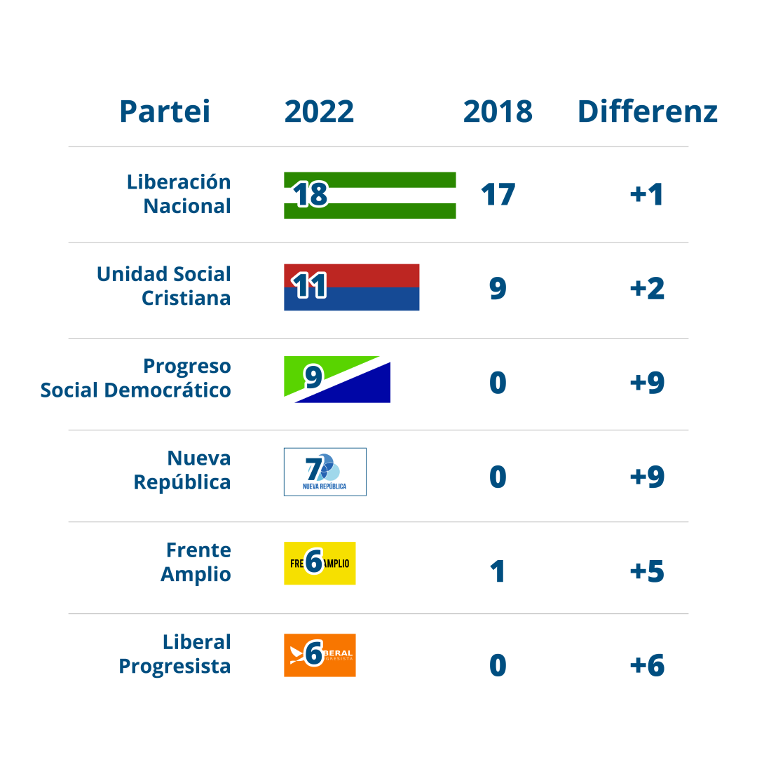 Noch steht die finale Auszählung der Stimmen aus, diese wird in einigen Wochen erwartet. Laut dem vorläufigen Ergebnis gehen die 57 Sitze der Asamblea Legislativa (AL) an sechs verschiedene Parteien. Damit kam es nicht zur befürchteten Zunahme der Parteienzersplitterung im Parlament.[10] Die beiden Traditionsparteien, die das Land jahrzehntelang in einem Zweiparteiensystem dominierten, PLN und PUSC, stellen die größten Fraktionen. Die PLN konnte ihre Präsenz in der Asamblea Legislativa um ein Mandat erweitern und wird mit 18 Sitzen klar stärkste Kraft. Im Falle eines Wahlsiegs von José Maria Figueres wäre diese Dominanz ein wichtiger Faktor für die Regierungsfähigkeit des Landes.[11] Die PUSC konnte nach derzeitigem Stand zwei Mandate hinzugewinnen und stellt mit elf Sitzen die größte Oppositionspartei. Mit der Partido Progreso Social Democrático von Rodrigo Chaves (9 Mandate) und Partido Liberal Progresista um den jugendnahen Wirtschaftsexperten Eliecer Feinzaig (6 Mandate) ziehen zwei neugegründete Parteien ins Parlament ein, die sich in ihrer Organisation erst noch konsolidieren müssen und bislang über keine parlamentarische Vorerfahrung verfügen. Die PRN um Fabricio Alvarado erhielt sieben Sitze. Die Regierungspartei PAC hat kein einziges Mandat errungen. Damit ist die Frente Amplio, die nun sechs Abgeordnete stellt, die einzige Partei mit einer linken Agenda, die im Parlament vertreten ist. Zwei Mandate sind noch umstritten: eines zwischen PUSC und PLN in Cartago, wo die Kandidatin der PUSC derzeit mit 126 Stimmen vorne liegt. Noch knapper ist der Abstand in Guanacaste, wo ein Kandidat der PUSC mit 58 Stimmen vor dem Kandidaten der PPSD liegt. Theoretisch besteht also die Möglichkeit, dass die PUSC diese beiden Sitze noch verliert.