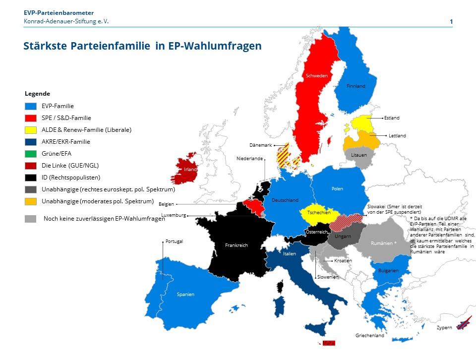• Die EVP-Familie ist in Umfragen in 11 Ländern die stärkste politische Familie, die sozialistische in 5 (aber nur wenn man die aktuell suspendierten slowakischen Parteien Smer und Hlas miteinrechnet). Die ID (rechter Rand) in 4, die liberale Renew liegt in 3 Ländern vorn, die Linke und die euroskeptisch-nationalkonservative EKR liegen in einem Land vorn. In Ungarn lag Fidesz vorne (noch nicht Teil einer Parteienfamilie) und in Lettland lagen zusammengerechnet formal unabhängige Parteien vorne.