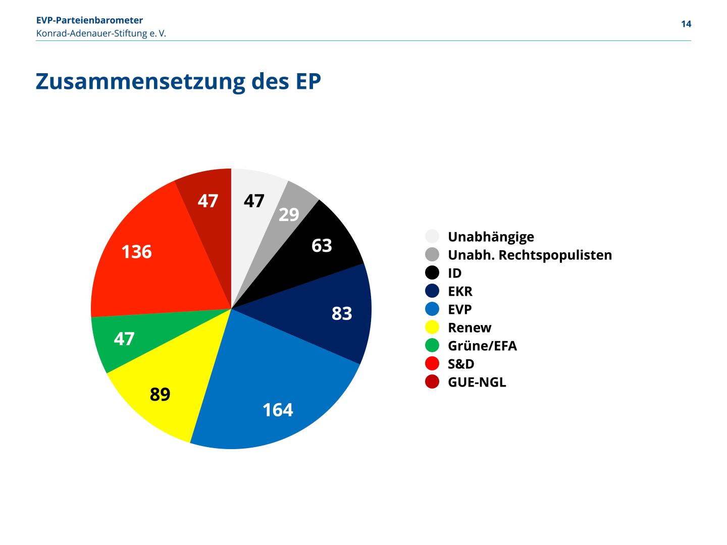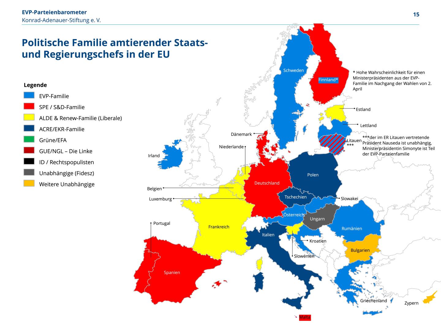 Die EVP-Familie ist in Umfragen in 11 Ländern die stärkste politische Familie, die sozialistische in 6. Die liberale/Renew liegt in 3, die euroskeptisch-nationalkonservative EKR und die ID (rechter Rand) in 2 Ländern vorn. Die Linke (GUE/NGL) führt in Irland. In Ungarn lag die Fidesz vorne (noch nicht Teil einer Parteienfamilie) und in Litauen lagen formal unabhängige Parteien oder mehrere Parteienfamilien umfassende Bündnisse vorne.