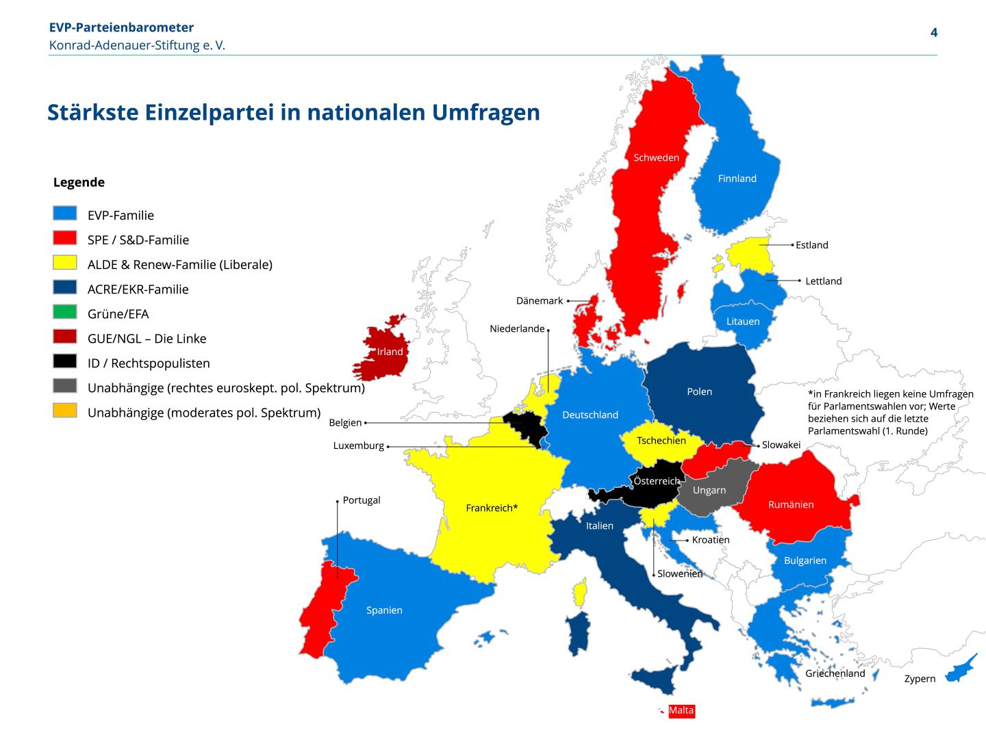 Die EVP-Familie ist in Umfragen in 10 Ländern die stärkste politische Familie (+2 im Vgl. zum letzten Barometer), die sozialistische in 7 (-1). Die liberale/Renew läge in 5, die euroskeptisch-nationalkonservative EKR in 2 (-1) Ländern vorn. Die Linke (GUE/NGL) führt in Irland, die rechtspopulistische ID in Österreich. In Ungarn lag die Fidesz vorne (noch nicht Teil einer Parteienfamilie) und in Litauen lagen formal unabhängige Parteien oder mehrere Parteienfamilien umfassende Bündnisse vorne.