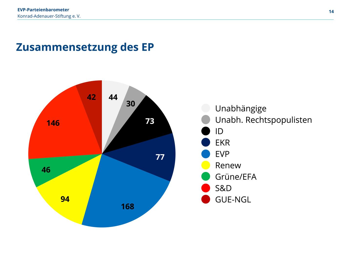 Die EVP-Familie ist in Umfragen in 10 Ländern die stärkste politische Familie, die sozialistische in 7. Die liberale/ Renew, die ID (rechter Rand) und die GUE-NGL (linker Rand) liegen in je 2 Ländern vorn, die euroskeptisch- nationalkonservative EKR in einem Land. In Ungarn lag die Fidesz vorne (noch nicht Teil einer Parteienfamilie) und in Lettland und den Niederlanden lagen zusammengerechnet formal unabhängige Parteien vorne. Das Bild ist etwas anders, wenn man auf die stärkste Einzelpartei und nicht die größte Parteienfamilie blickt: Dann führt die EVP in 10 Ländern, die Sozialisten in 6, die Liberalen und die ID in 3, die EKR und die Linke in je 2 vorne. In Ungarn ist Fidesz (noch keine neue Parteienfamilie) in Führung. Der Vorsprung vor anderen Parteienfamilien oder anderen Einzelparteien ist oftmals sehr knapp (u.a. Portugal, Slowenien, Polen, Belgien, Dänemark, Bulgarien), bzw. andere Umfragen sehen eine andere Parteienfamilie oder Einzelpartei vorne. In sechs Ländern liegt die größte EVP-Partnerpartei in Umfragen oder kürzlich stattgefundenen Wahlen noch bei über 30% (Malta, Kroatien, Spanien, Slowenien, Griechenland und nun auch knapp Polen).