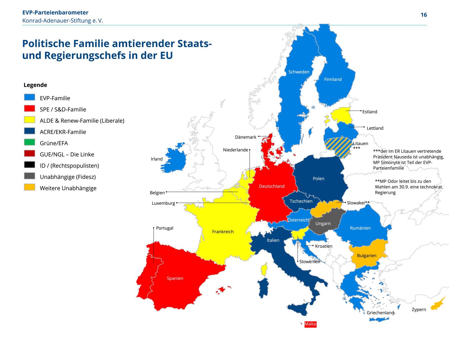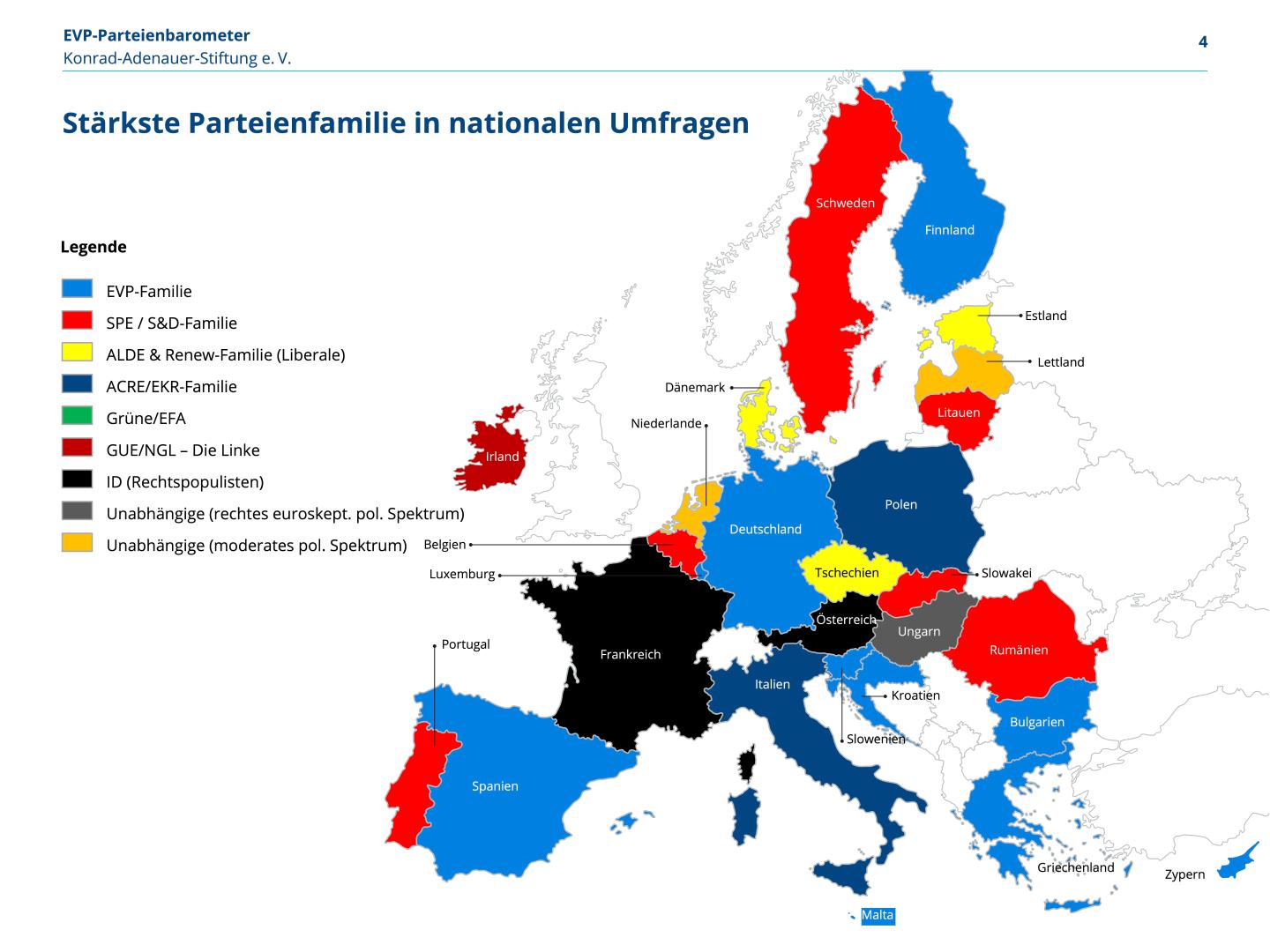 Die EVP-Familie ist in Umfragen in 10 Ländern die stärkste politische Familie, die sozialistische in 6. Die liberale/ Renew liegt in 3, die euroskeptisch-nationalkonservative EKR und die ID (rechter Rand) in 2 Ländern vorn. Die Linke (GUE/NGL) führt in Irland. In Ungarn lag die Fidesz vorne (noch nicht Teil einer Parteienfamilie) und in Lettland und den Niederlanden lagen formal unabhängige Parteien vorne.