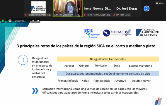3. La Licda. Adriana Velásquez planteó el enfoque social y expresó los tres principales retos de los países de la región: 1. Impacto de la crisis sanitaria, económica y fiscal generada por COVID 19, 2. las implicaciones del cambio demográfico, tecnológico y ambiental, 3. la desigualdad multifactorial en el reparto de los beneficios y costos del desarrollo.