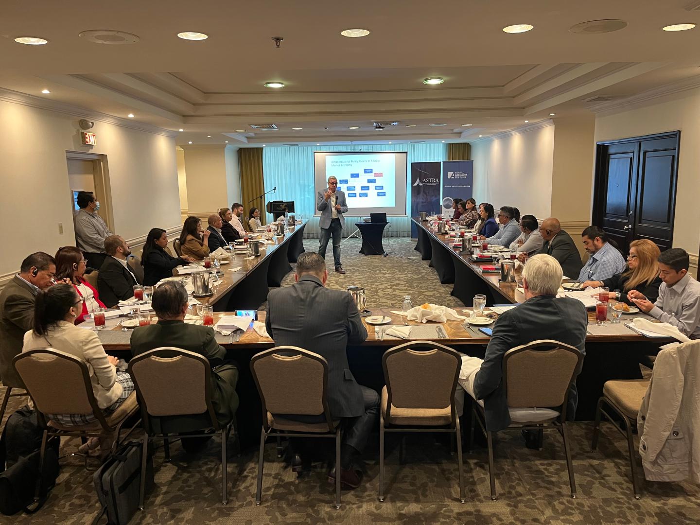 Las palabras de bienvenida fueron dirigidas por el Dr. Nicholas Virzi, Director del Instituto de Liderazgo y Gobernanza Astra de la Fundación Industrial, Guatemala, y por Virginia Barrios, coordinadora de proyectos de la KAS Guatemala. La conferencia fue impartida por el Dr. Marcus Marktanner, conferencista invitado por la Fundación Konrad Adenauer, doctor en economía y experto en ESM.  El conferencista presentó los principios básicos de la ESM, y explicó cómo la política industrial de Alemania se ha enmarcado en dichos principios. Posterior a eso, los participantes pudieron hacerle consultas, principalmente relacionadas a la implementación de los principios en Guatemala, y de cómo poder seguir impulsando el desarrollo industrial en el país.