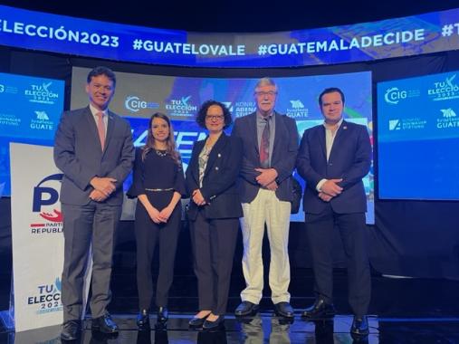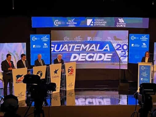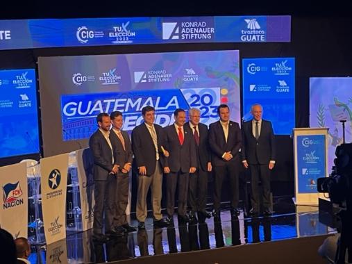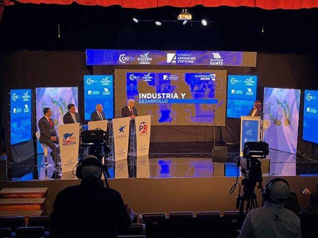 Luego, dio inicio el primer foro de candidatos a la presidencia de la República de Guatemala, transmitido en vivo por TV Azteca Guatemala, desde el auditorio de la CIG. Las preguntas giradas a los candidatos se refirieron a los siguientes bloques temáticos: