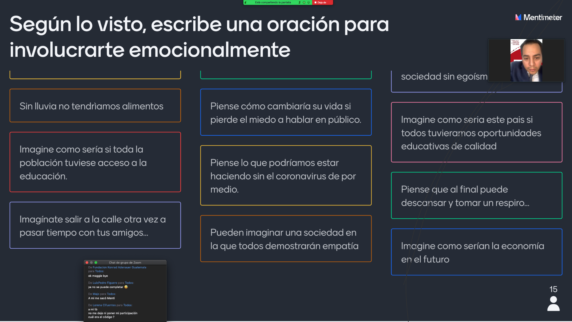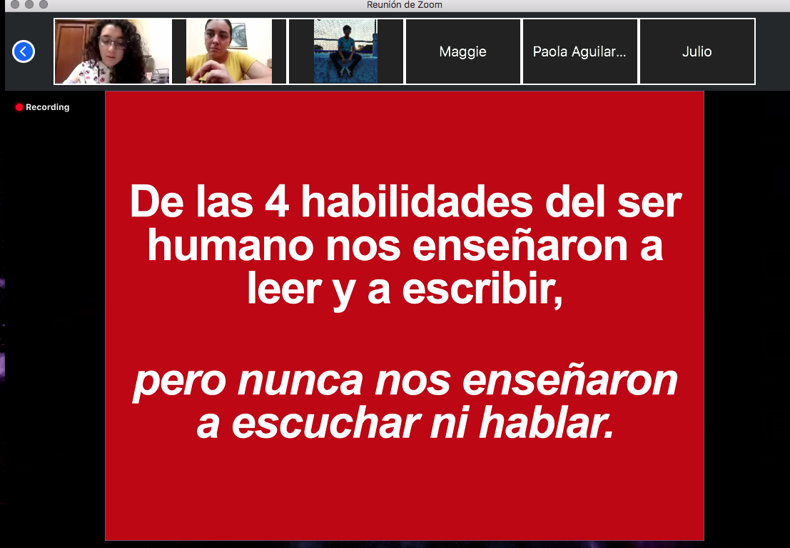 Se realizaron dinámicas y ejercicios con los becarios sobre exposiciones personales con un objeto, leer un texto y además se hizo un intercambio de preguntas en Mentimeter.