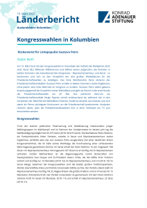 Trotz der starken politischen Polarisierung und Mobilisierung insbesondere junger Wählergruppen im Wahlkampf und im Rahmen der Sozialproteste im letzten Jahr lag die Wahlbeteiligung lediglich bei 45,9 Prozent (2018: 48,8 Prozent). Die Wahlallianz Pacto Histórico, ein Parteienbündnis linker Parteien, erzielte in Senat und Repräsentantenhaus starke Ergebnisse, verfehlte aber das von Gustavo Petro ausgerufene Ziel einer deutlichen linken Kongressmehrheit, die im Falle seines Wahlsiegs die Durchsetzung einer umfassenden Reformagenda garantieren könnte. Im Senat erhält der Pacto Histórico 16 von insgesamt 108 Sitzen. Im Repräsentantenhaus mit insgesamt 187 Sitzen ist er künftig mit 25 Repräsentanten vertreten. Großer Wahlverlierer ist die Regierungspartei Centro Democrático von Staatspräsident Ivan Duque und Ex-Präsident Alvaro Uribe, die die Hälfte ihrer Fraktion verliert und künftig nur 16 Mandate (2018: 32) im Repräsentantenhaus und 14 (2018: 19) im Senat belegt. Gewinner der Kongresswahlen sind die beiden großen Traditionsparteien, Partido Liberal (Mitte-links) und Partido Conservador (Mitte-rechts). Der Partido Liberal stellt im Repräsentantenhaus künftig mit 32 Abgeordneten die größte Fraktion und ist im Senat mit 15 Mandaten drittstärkte Kraft. Der Partido Conservador ist gemeimsam mit dem Pacto Histórico stärkste Kraft im Senat (16 Mandate, 2018: 14) und erhält im Repräsentantenhaus 25 Sitze (2018: 21).
