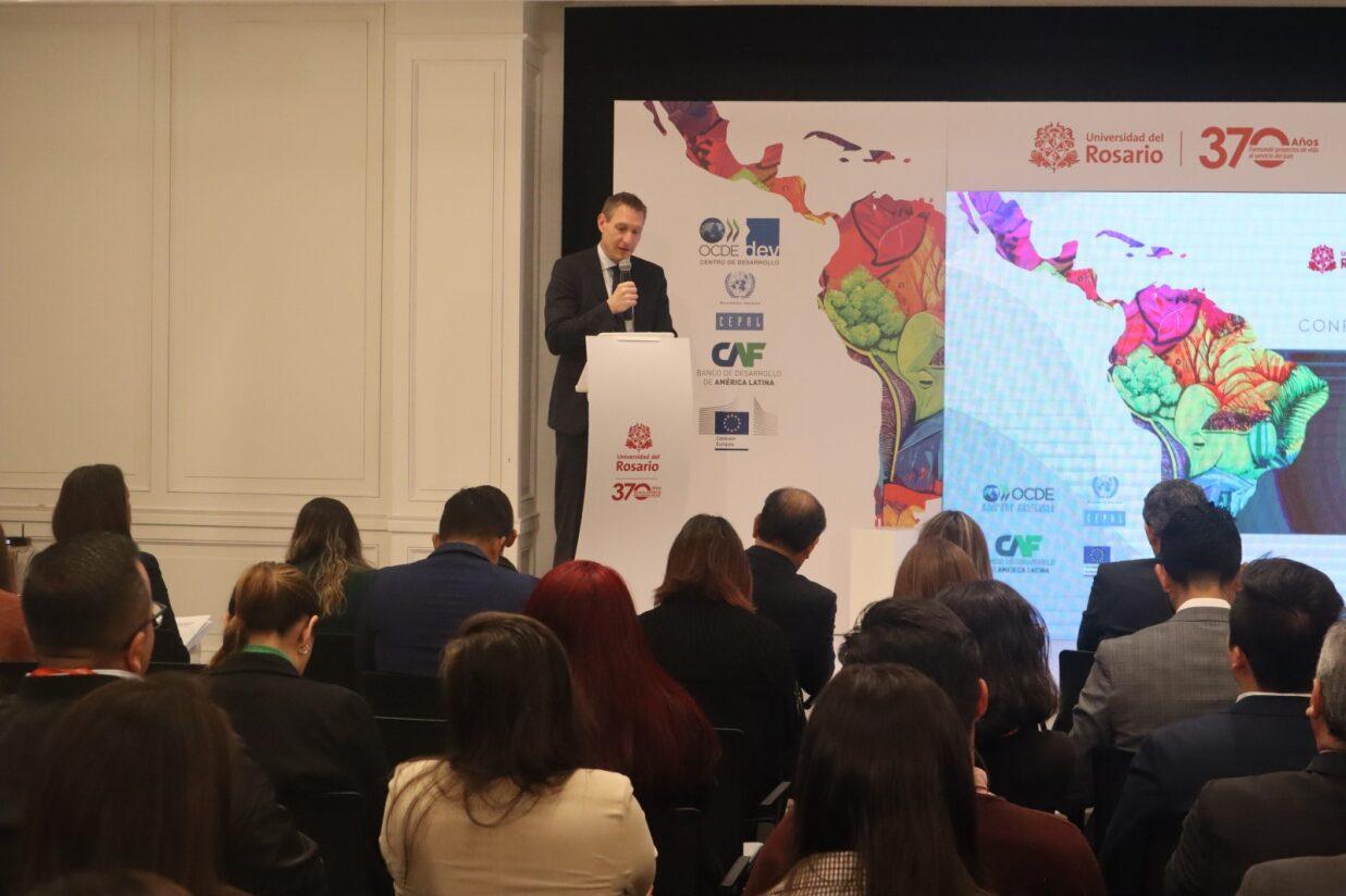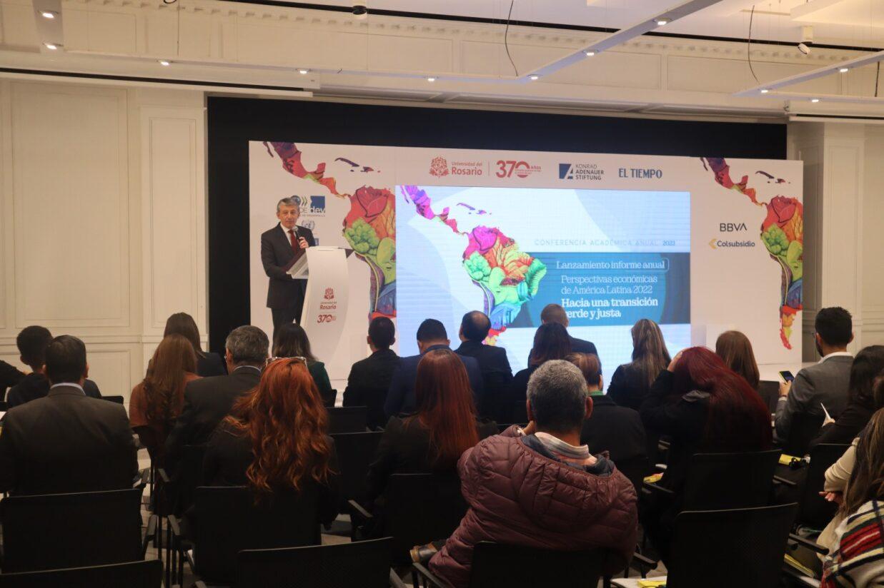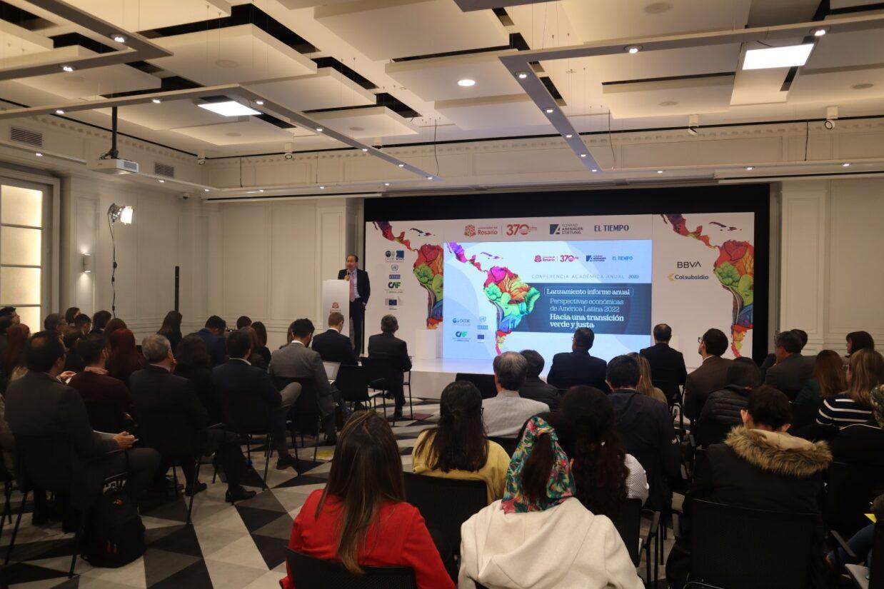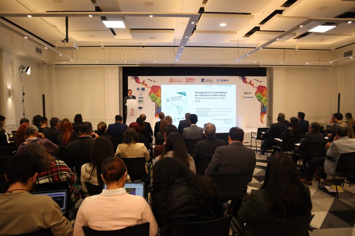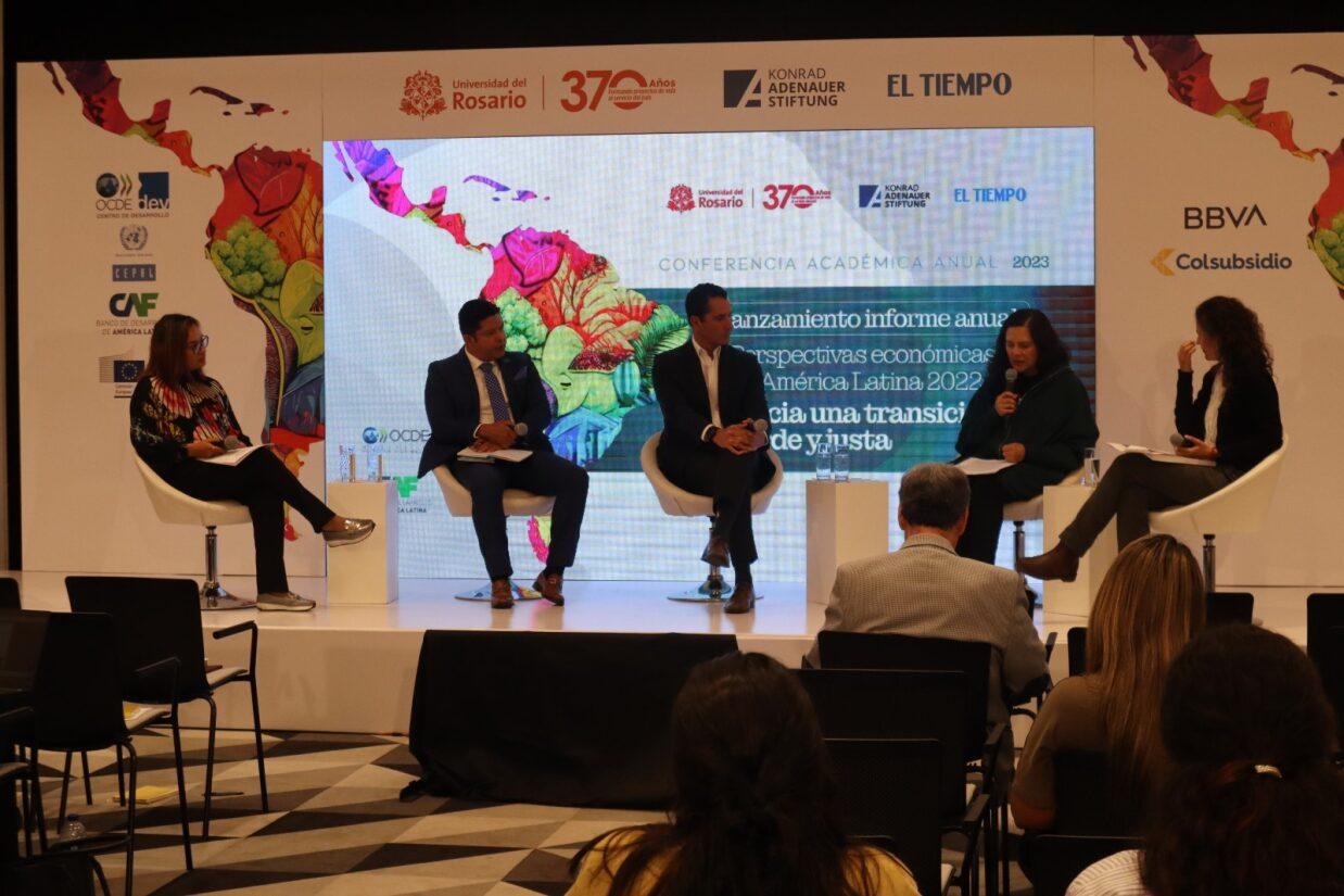 La primera parte del evento se dio en torno a la presentación del informe titulado para 2022: “Perspectivas Económicas de América Latina: hacia una transición verde y justa”, donde se analizan los principales retos en materia de desarrollo y se plantean recomendaciones, experiencias y buenas prácticas para la elaboración de políticas públicas. Este reporte fue preparado por el Centro de Desarrollo de la OCDE (Organización para la Cooperación y el Desarrollo Económicos), en colaboración con la CEPAL (Comisión Económica para América Latina y el Caribe), el CAF (Banco de Desarrollo de América Latina) y la Comisión Europea. Dicha presentación fue liderada por Juan Miguel Gallego, Subdirector General de Prospectiva y Desarrollo Nacional en el Departamento Nacional de Planeación, Sebastián Nieto Parra, Jefe del Centro de Desarrollo de la OCDE para América Latina y el Caribe, Marco Llinás, Director de Desarrollo Productivo y Empresarial de la CEPAL y Carolina Camacho, Economista del CAF, quienes presentaron los principales puntos del informe.