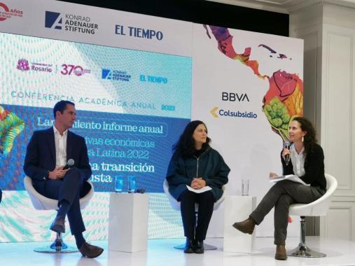 El evento dio inicio con las palabras del rector de la Universidad del Rosario, Alejandro Cheyne García, quien agradeció a los panelistas, aliados y demás participantes, igualmente señaló la situación actual por la que está atravesando Latinoamérica y el Caribe en materia de cambio y su notable esfuerzo por realizar una transición verde y justa que permita repensarnos como región y afrontar de mejor manera los nuevos retos y oportunidades frente a un mundo cambiante. Seguido a esto, Stefan Reith, representante de las KAS en Colombia, expuso el trabajo que la fundación desempeña para el fortalecimiento de la democracia a través de cinco ejes temáticos: el desarrollo sostenible, la construcción de paz, la seguridad y la defensa, la descentralización y el fortalecimiento de las instituciones democráticas. Asimismo, se refirió a la importancia de alcanzar un equilibrio en lo social, lo económico y lo ecológico en la región para propiciar una transición viable para 2050 de la mano del fortalecimiento de la cooperación internacional y el cumplimiento de tratados y convenciones como el Pacto Verde Europeo. La presentación finalizó con las palabras de Andrés Mompotes, Director General de El Tiempo Casa Editorial, quien señaló la pertinencia de propiciar espacios de debate y diálogo en torno a la sostenibilidad económica, fiscal y productiva de Colombia como país líder en la transición energética de la región.