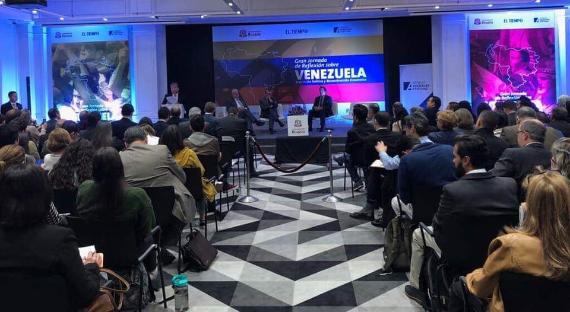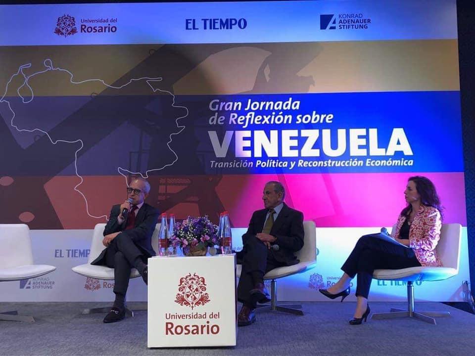 En el Panel sobre “Reconstrucción Económica”, participaron Guillermo Perry, exministro de Hacienda de Colombia, Javier Rodríguez, representante del presidente Guaidó para el Plan País, Antonio García, enviado de la Delegación de la Unión Europea en Colombia y Ricardo Lozano, ex embajador de Colombia en Venezuela. En el desarrollo del panel se aclaró que el objetivo del Plan País es detener la hiperinflación, afrontar y restructurar la deuda externa y pasar de subsidios indirectos a subsidios directos. También se cuestionó cómo recuperar el aparato productivo por medio de la cooperación y se resaltó la importancia del sector privado y de los gremios en este proceso. Igualmente, se resaltó la necesidad de un plan retorno para que las personas competentes y capacitadas regresen al país y empujen la economía. Finalmente, el panel destacó la oportunidad para Colombia en términos de inversión en infraestructura, servicios públicos, hidrocarburos y en el sector de alimentos y bienes de consumo.