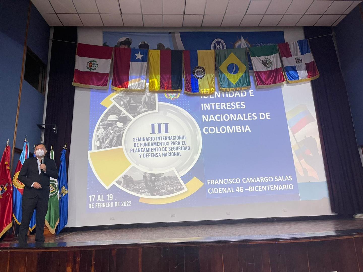 Continuando con la serie de ponencias, Francisco Alfonso Camargo Salas, Director Nacional de Empleo Público, habló sobre la identidad e interés nacionales en Colombia. Comenzó resaltando que la identidad e intereses nacionales son esenciales para la supervivencia de un Estado. Sin embargo, explicó que no es deber del ejecutivo, sino que por el contrario, es una cuestión a escala del Estado-nación; esto quiere decir que depende de la nación en general. Su exposición concluyó reflexionando hacia dónde debe apuntar la identidad nacional de Colombia y señaló que debe estar enmarcada en la seguridad física, la preservación del sistema democrático, la presencia integral de la institucionalidad en el territorio nacional, la prosperidad y el desarrollo sostenible.