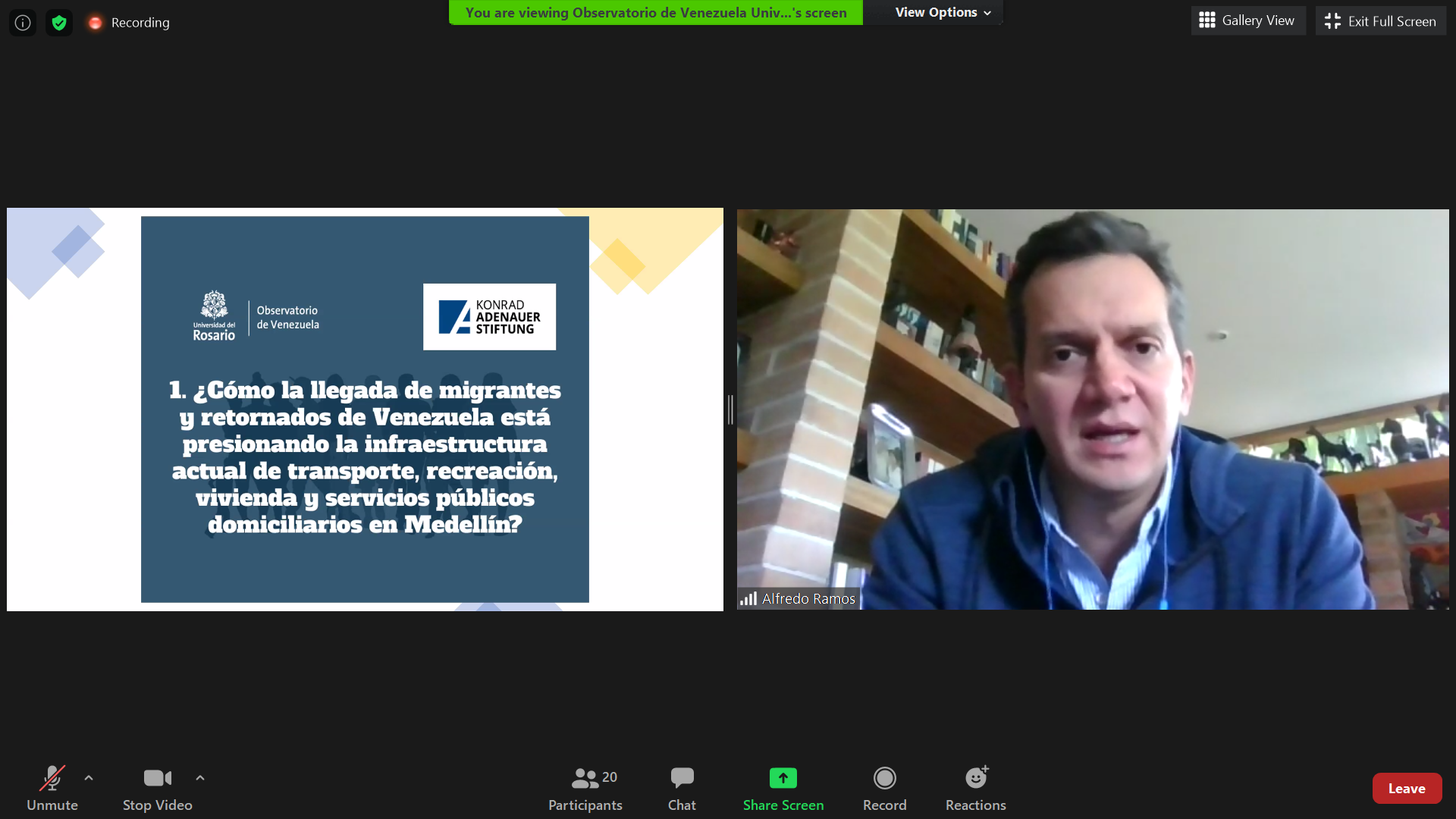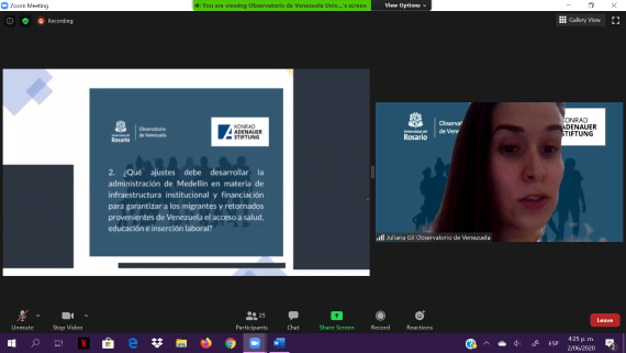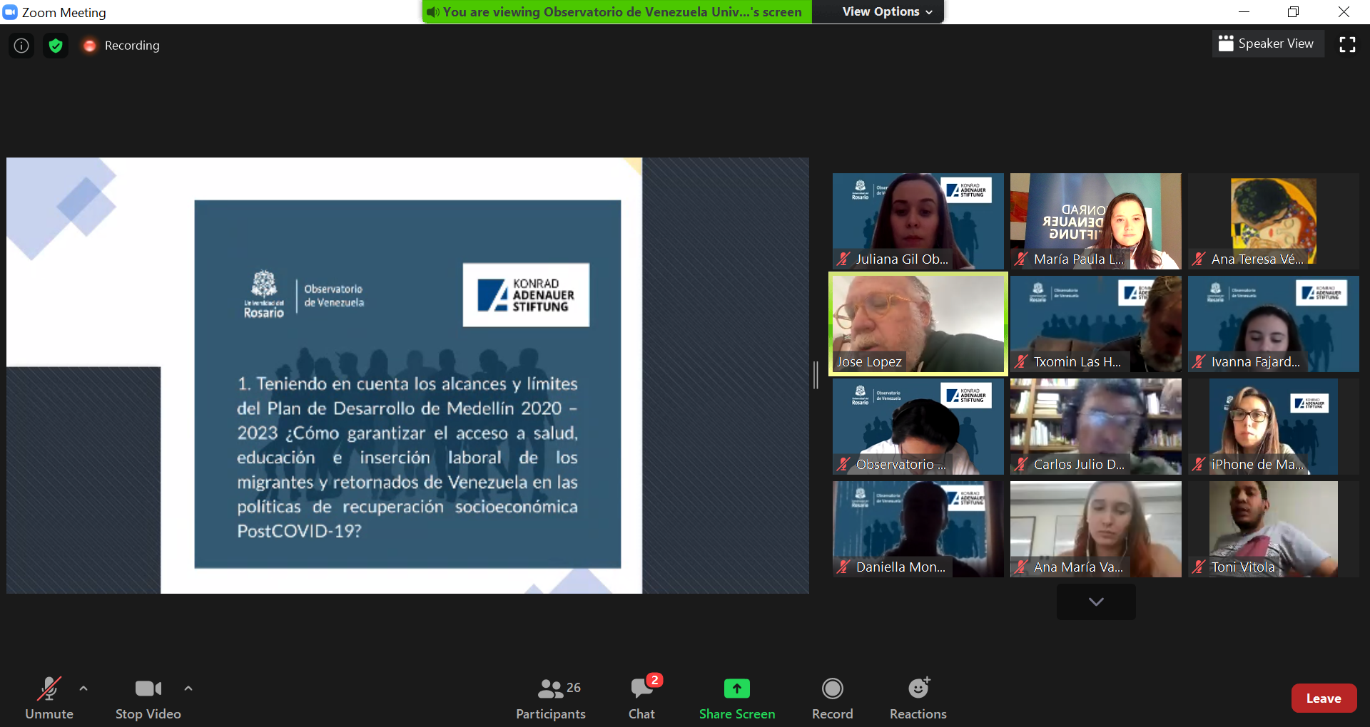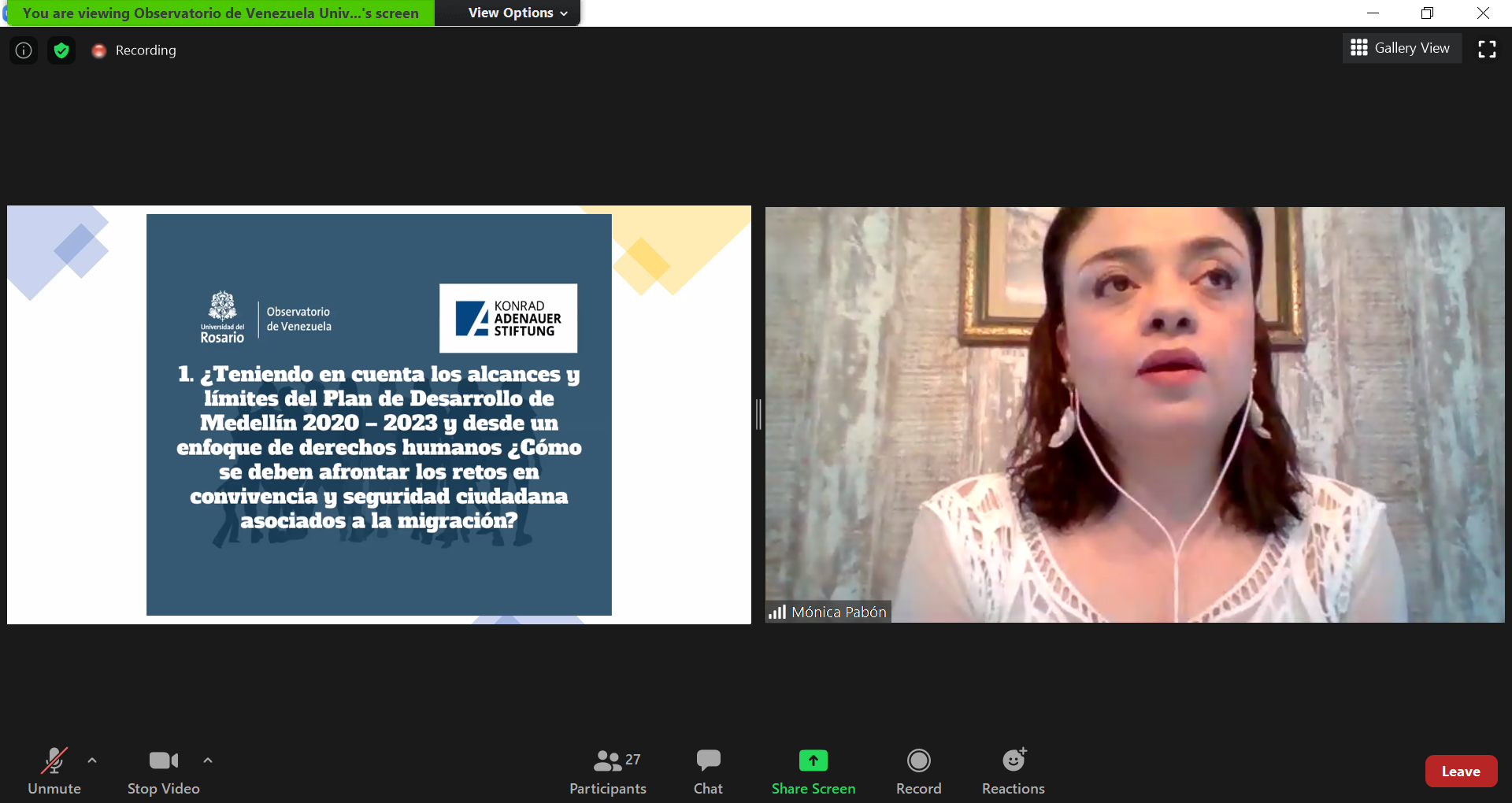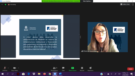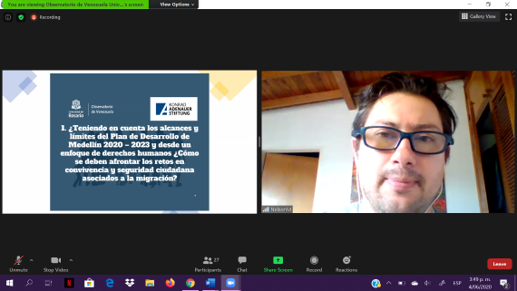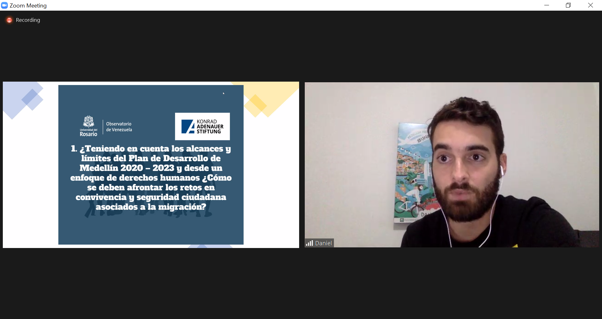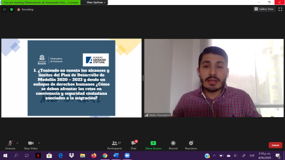El investigador Ronal Rodríguez, miembro del Observatorio, resaltó el trabajo en la búsqueda de insumos de política pública que guíen la respuesta para la atención a las poblaciones migrantes en las ciudades donde se experimenta una mayor movilidad humana proveniente de Venezuela. Por su parte, María Paula León, Coordinadora de Proyectos, señaló el compromiso de la KAS en el apoyo a iniciativas que conlleven al fortalecimiento del Estado de derecho y la democracia en las distintas ciudades de Colombia.