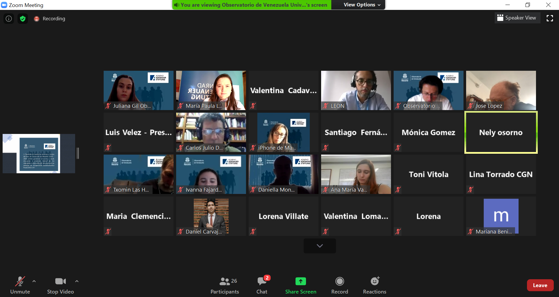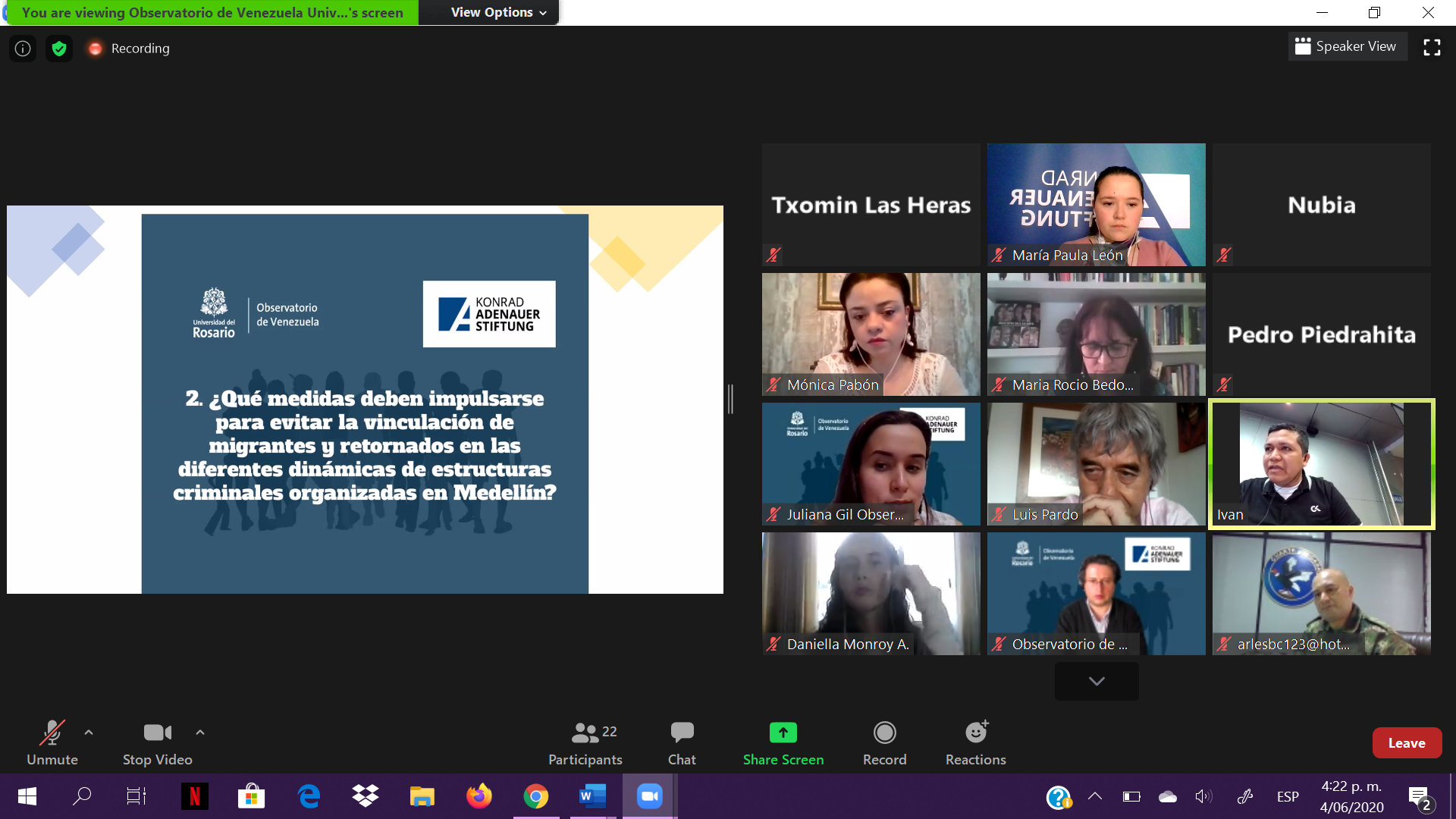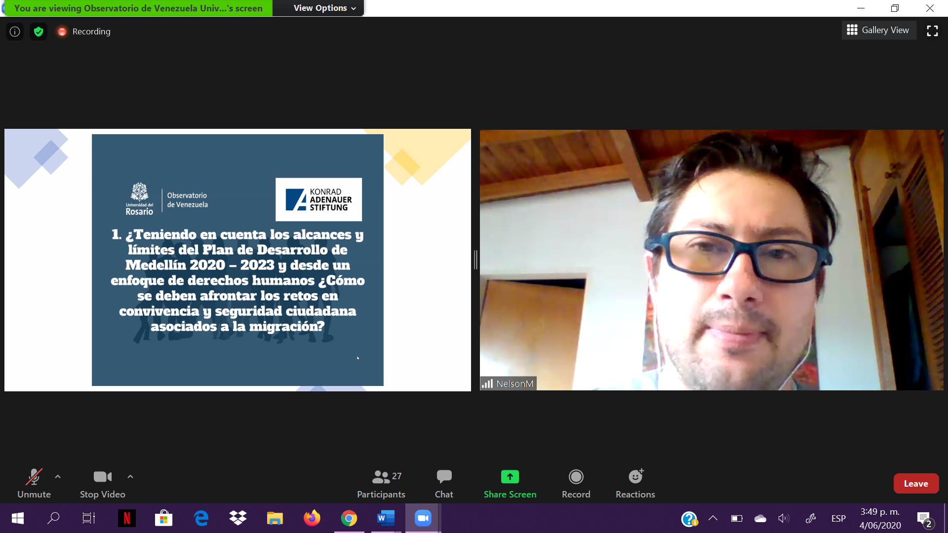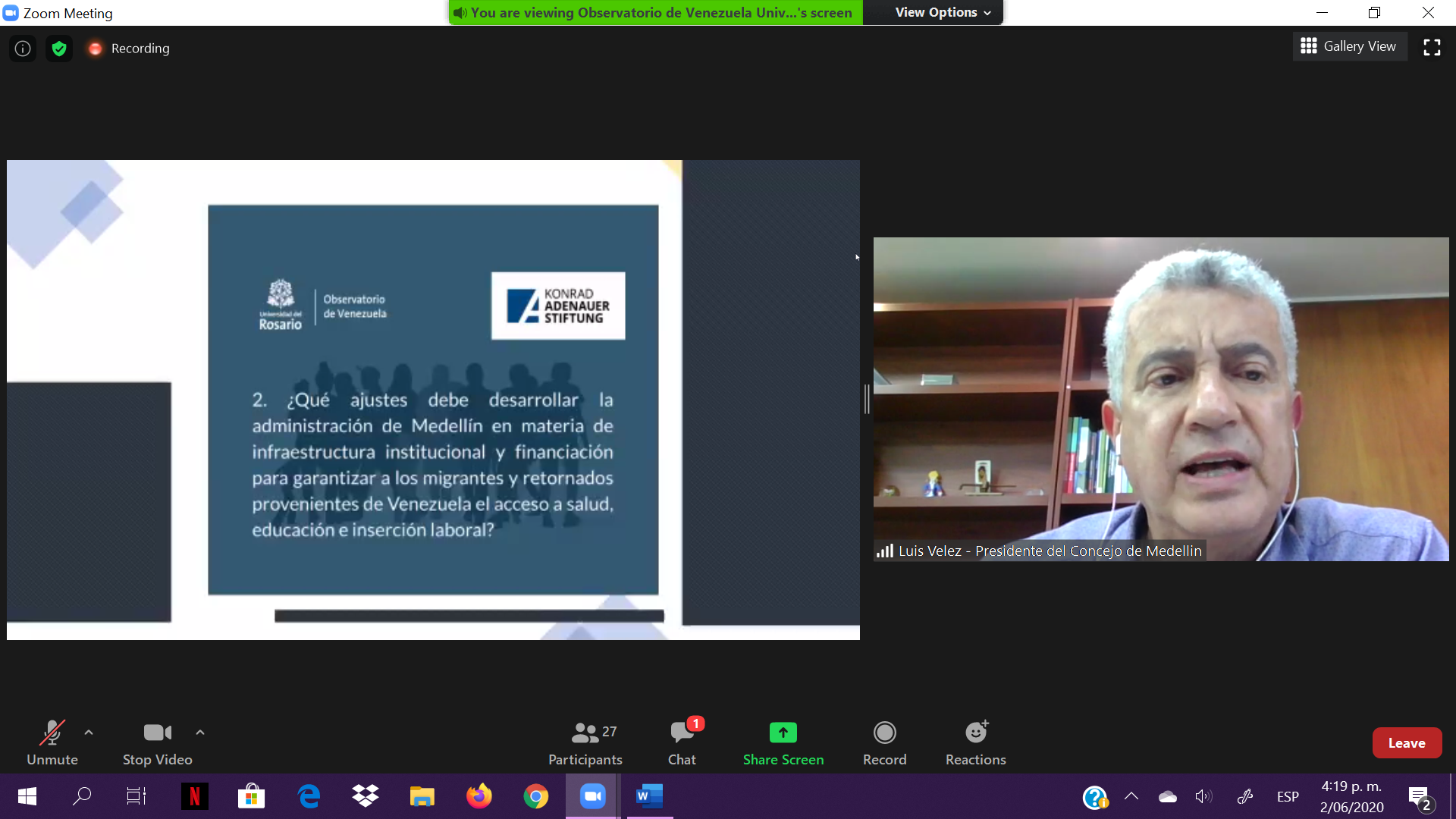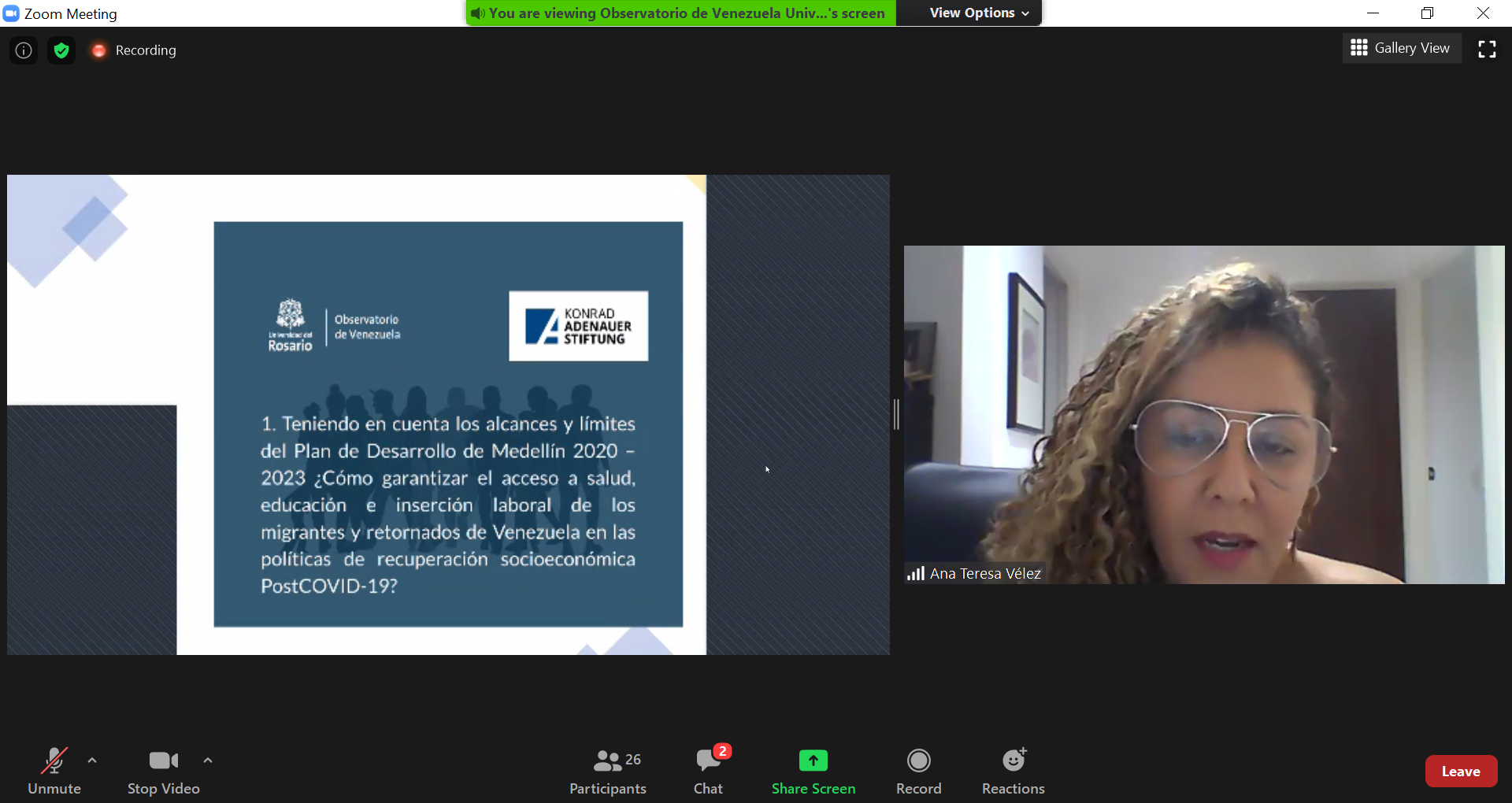 El investigador Ronal Rodríguez, miembro del Observatorio, resaltó el trabajo en la búsqueda de insumos de política pública que guíen la respuesta para la atención a las poblaciones migrantes en las ciudades donde se experimenta una mayor movilidad humana proveniente de Venezuela. Por su parte, María Paula León, Coordinadora de Proyectos, señaló el compromiso de la KAS en el apoyo a iniciativas que conlleven al fortalecimiento del Estado de derecho y la democracia en las distintas ciudades de Colombia.