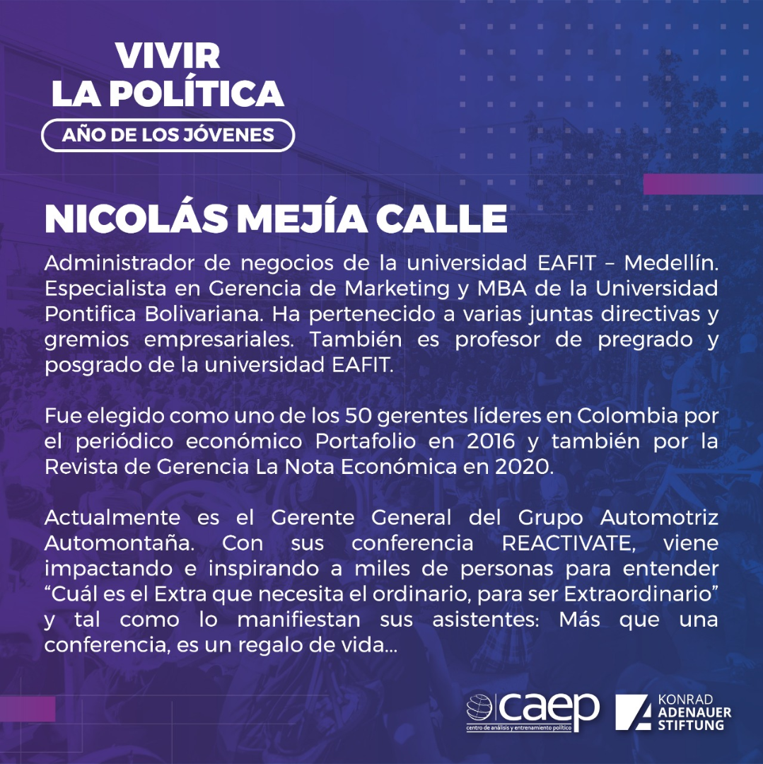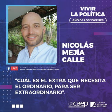 La serie se dirige en este año a jóvenes, sobre todo aquellos que quieren ser líderes en el mundo político. Por esta razón, el CAEP eligió como ponente de la primera charla al empresario, profesor universitario y conferencista, Nicolás Mejía Calle. En una emotiva presentación, Mejía explicó el verdadero significado de la política y dio consejos para ser un gran líder.