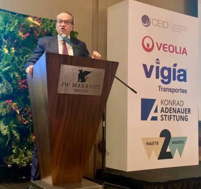 Andrea Valdelamar, en nombre de la KAS, anunció la importancia de que los países empiecen a diseñar modelos de desarrollo sustentados en la sostenibilidad ambiental. Mencionó los muchos beneficios que trae como la innovación, la competitividad y la creación de productos que alimentan otras cadenas de valor. Finalmente, señaló la importancia de espacios como este para el intercambio de conocimiento y adelantar propuestas que impacten de forma positiva el medio ambiente, compromiso que la KAS ha asumido globalmente. En seguida, Alex Saer, Director de Asuntos Ambientales de la Sectorial Urbana del Ministerio de Hacienda, compartió los avances que desde el ministerio se han adelantado para la generación de cadenas de valor con elementos de economía circular. A continuación de esto, Saer manifestó el compromiso que tiene el gobierno nacional con la promoción de iniciativas que generen materias primas de segundo uso y la importancia de que desde el sector privado también se implementen este tipo de alternativas. Después, Manuel Rodríguez agradeció la constante invitación a estos espacios por parte de Gilberto Rincón y CEID Colombia. Enfatizó en que los ciudadanos no pueden seguir pensando que la protección ambiental es un problema del Ministerio de Ambiente y que el desarrollo de Colombia se debe centrar fundamentalmente en la reorientación de la agricultura, la urbanización de las ciudades, el manejo y tratamiento de los materiales y la energía y en la protección de los ecosistemas de los que disponemos. Jarmo Kuuttil hizo a la importancia de pasar de una economía lineal que genera muchos desechos físicos, a una economía circular que permita el aprovechamiento de materias de segundo uso para adaptarse a las problemáticas generadas por el cambio climático. Peter Ptassek expresó que el Gobierno de Alemania está comprometido con detener la contaminación ambiental en Alemania y el mundo, y por esto la economía circular y su reconstrucción ecológica se vuelven esenciales en este proceso. Finalmente, Fernando Carrillo resaltó que desde la Procuraduría se han emprendido toda una serie de estrategias para velar porque el actuar de las entidades públicas responda al cuidado y protección del medio ambiente. Entre muchas de estas, lograr que en las Corporaciones Autónomas Regionales y otras entidades relacionadas con el cuidado y protección del medio ambiente no se vuelvan fortines políticos regionales y se contenga toda actividad delictiva por parte de los funcionarios públicos de la mismo. Mencionó que el medio ambiente es considerado por muchos constitucionalistas como un derecho de tercera generación, pero hoy la vida, la libertad y otros derechos primarios dependen directamente de la conservación de un ambiente sano y sostenible, lo que lo convierte en un derecho primario.