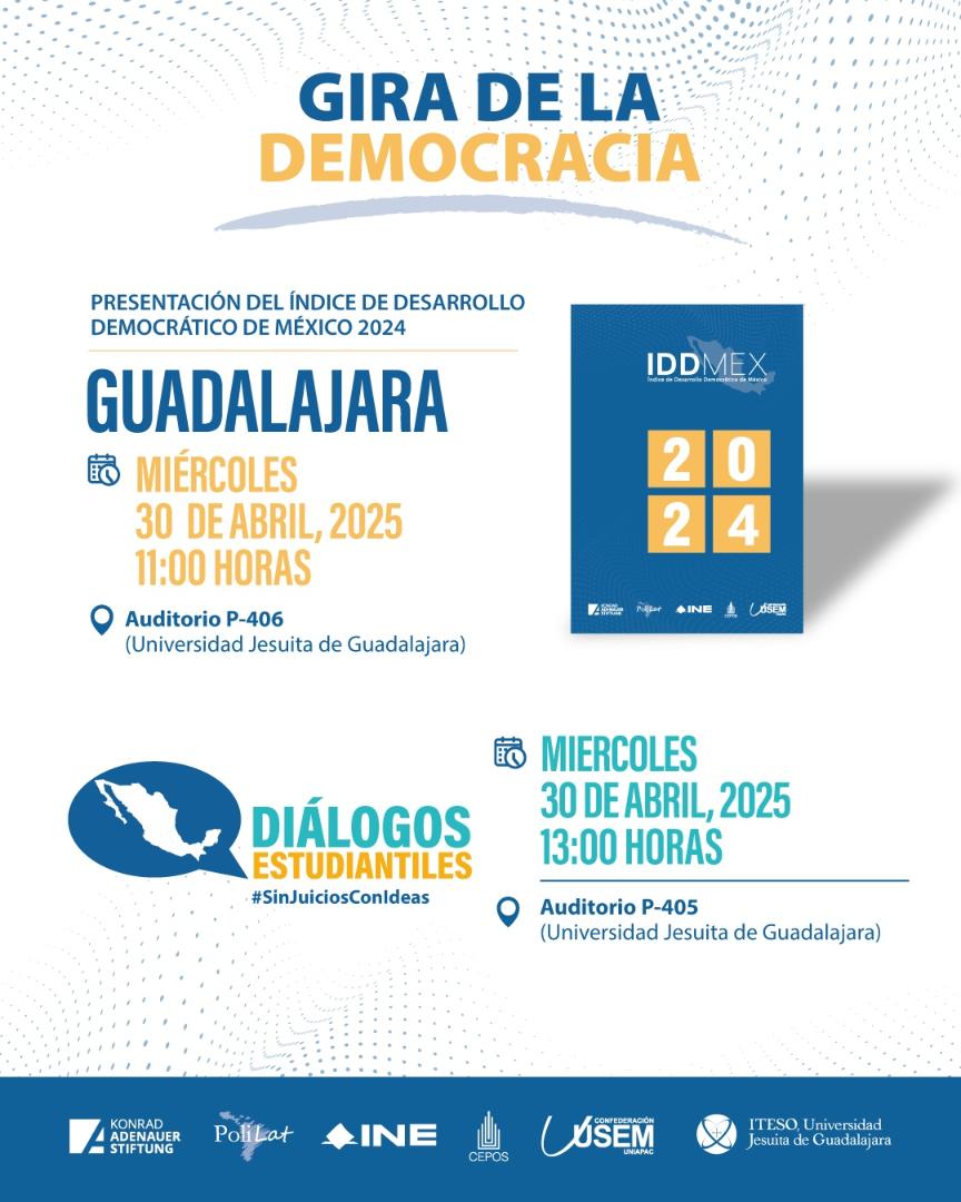 Como parte de dicha gira, realizaremos, en colaboración con la Universidad Jesuita de Guadalajara (ITESO), la presentación del Índice de Desarrollo Democrático de México (IDD-MEX 2024), un estudio creado para analizar las fortalezas y debilidades en el desarrollo de la democracia mexicana, el cual permite a las dirigencias políticas, sociales y económicas contar con elementos de diagnóstico útiles para diseñar políticas públicas específicas que ayuden a lograr mayor desarrollo en las entidades federativas del país.
