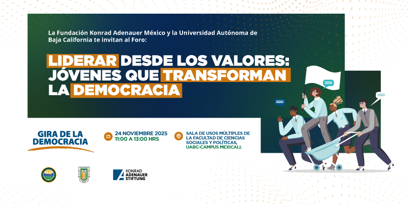 En el marco de la Gira de la Democracia 2025, la Fundación Konrad Adenauer México (KAS México), en colaboración con la Universidad Autónoma de Baja California (UABC), Campus Mexicali, llevará a cabo el taller “Liderar desde los Valores: Jóvenes que transforman la De­mocracia” el 24 de noviembre de 2025, de 11:00 a 13:00 horas.