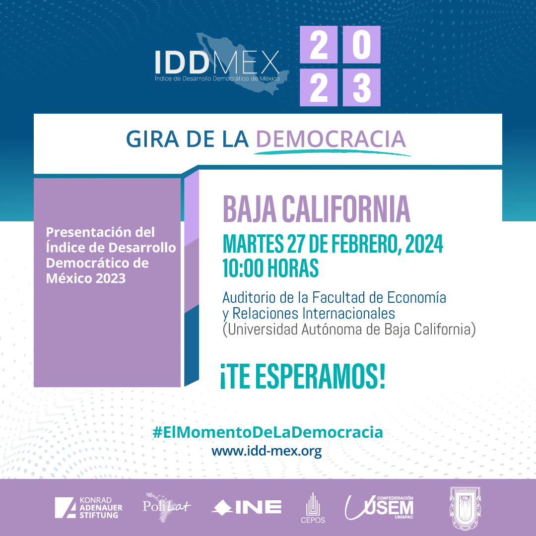 Como parte de la Gira de la Democracia, la Fundación Konrad Adenauer (KAS) en México en colaboración con la Universidad Autónoma de Baja Claifornia (UABC) realizaremos la presentación estatal del Índice de Desarrollo Democrático de México (IDD-MEX) 2023 en Tijuana, Baja California.
