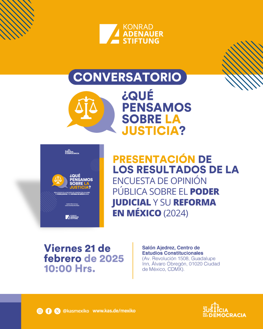 La Fundación Konrad Adenauer (KAS) en México presentará los resultados de la encuesta de opinión pública sobre el Poder Judicial y su Reforma en México (2024), el próximo viernes 21 de febrero de 2025, a las 10 Hrs., en el salón Ajedrez del Centro de Estudios Constitucionales.