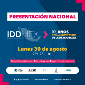 El pasado lunes 30 de agosto se realizó la presentación nacional del Índice de Desarrollo Democrático de México (IDD-Mex) 10 años "Evolución y retos de la democracia", con el cual se conmemora la primera década de evaluar la democracia en México.