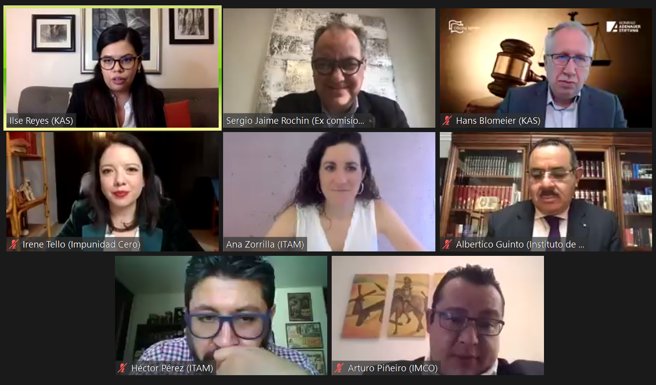 El evento estuvo moderado por Ilse Reyes, Gerente de Proyectos de la KAS México, y se contó con la participación de los panelistas, Arturo Piñero, Investigador del IMCO, Héctor Alberto Pérez, Profesor del ITAM, Sergio Jaíme Rochín del Rincón, Comisionado Ejecutivo de la Comisión de Atención a Víctimas, Albertico Guinto Sierra, Director General del Instituto de Estudios Ratio Legis e Irene Tello, Directora Ejecutiva de Impunidad Cero.