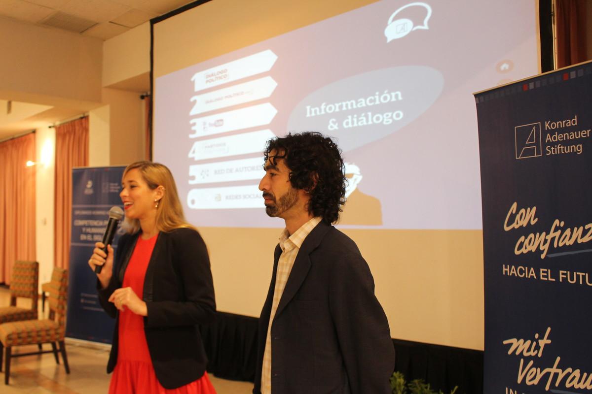 Además contamos con la presentación de Enmanuel Gainza, Vicepresidente Concejo Deliberante de la ciudad de Paraná, Argentina, con estrategias para el desarrollo de acciones políticas legislativas o ejecutivas con impacto social. Resaltó 3 características de modelo de liderazgo del siglo XXI en la política, destacando el humanismo, la vocación de servicio y una visión humanista, en lo que el líder debe contar con las 3P: pasión, profesionalismo y perseverancia. Gainza, enfatizó que las acciones políticas deben tener impacto social y para ello es importante una gestión y comunicación óptima, comprendiendo la importancia de un plan de comunicaciones para la elaboración del hacer, en la que recomendó el implemento de una matriz FODA, para poder verificar las fortalezas y debilidades, seguidamente de la selección del equipo de trabajo para analizar lo que realmente le importa a la gente. "Es importante que en los ejes de trabajo exista una distribución de responsables con conocimiento en políticas públicas para que exista un seguimiento efectivo en los planes de acción”, señaló. La comunicación efectiva es una herramienta fundamental en la política, por ello se debe involucrar una agenda de trabajo, desarrollar un plan de medios organizada y mantener un análisis y monitoreo de los mensajes. Activando una imagen fresca y de transformación donde involucramos como estrategias los relatos de vida activando discursos de transformación con ideas claras de las propuestas. “El liderazgo es positivo y tiene un rol fundamental en la sociedad, debemos ser conscientes en trabajar en la construcción de equipos con profesionalismo con la capacidad real de concretar la visión de la organización, generarando impacto y transformación”, dijo.