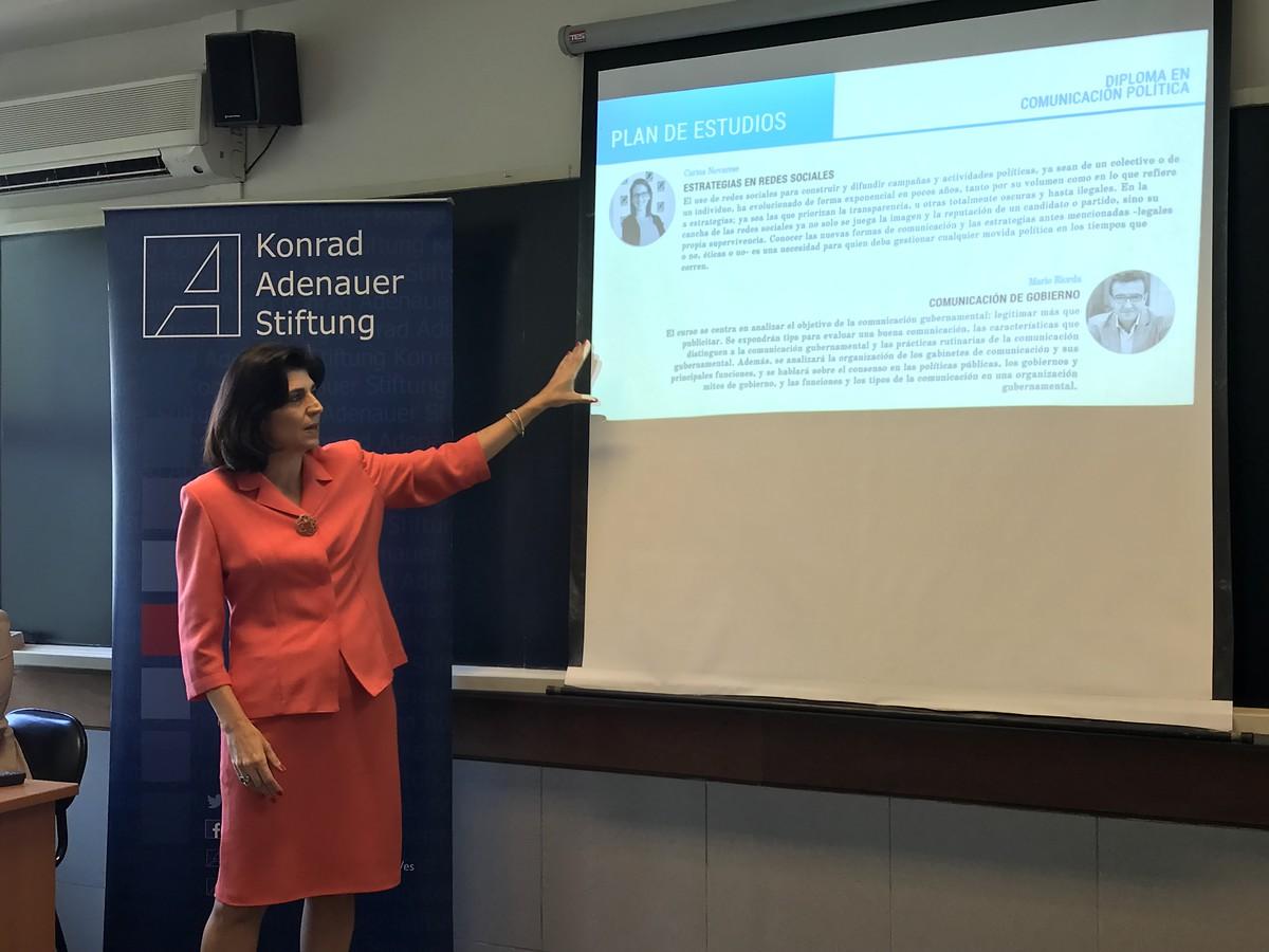 "Esto es exactamente lo que pretende nuestro nuevo diplomado en Comunicación Política, el cual estamos abriendo hoy", agregó Patricia Schröder de la Facultad de Ciencias de la Comunicación de la Universidad de Montevideo. "Junto con la Fundación Konrad Adenauer iniciamos hoy este nuevo programa de formación para dar a jóvenes profesionales la oportunidad de desarrollar sus conocimientos y habilidades en la comunicación política", dijo la profesora.