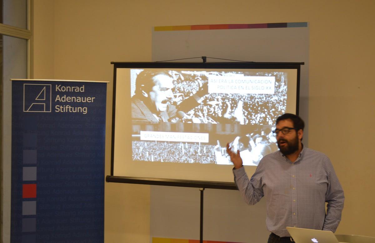El director digital del PRO para la provincia de Buenos Aires, Esteban Bianchi, expuso sobre el uso de las redes sociales en la política. La importancia de elegir las que abarcan un mayor universo de usuarios, aplicados a los conceptos de afinidad y relevancia de contenido, optimizando datos reales de la sociedad, teniendo como siguiente paso, el análisis del alcance y la interacción de los contenidos que surgen de los creativos. Bianchi introdujo a los comunicadores de Uruguay a la estrategia de desarrollo de herramientas tecnologías aplicadas a la confección de bases de datos.