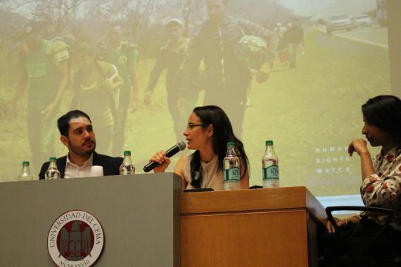 Arellano se encargó de la presentación de los 14 autores que hacen el libro mientras Taraciuk inició su disertación mostrando un video sobre la vida de los “caminantes”, inmigrantes venezolanos que huyen a pie por la frontera con Colombia o el norte de Brasil buscando una nueva vida en otras latitudes. En ese sentido, expuso que en la frontera Brasil-Venezuela hay en la actualidad 13 albergues para refugiados que hospedan a más de 5 mil venezolanos, gracias al apoyo de la Organización Internacional para las Migraciones y la Agencia de Naciones Unidas para los Refugiados: “En la frontera con Cúcuta en Colombia mucha gente espera horas para cruzar la línea fronteriza, ir a comer a los refugios del lado colombiano y después regresar a sus casas en el estado Táchira (Venezuela)".
