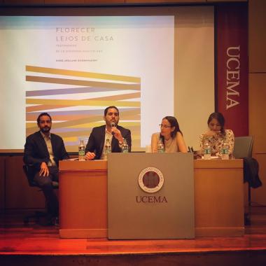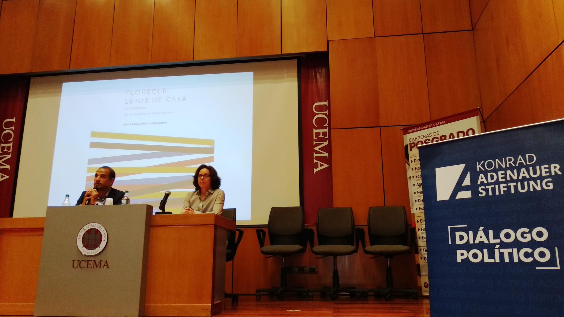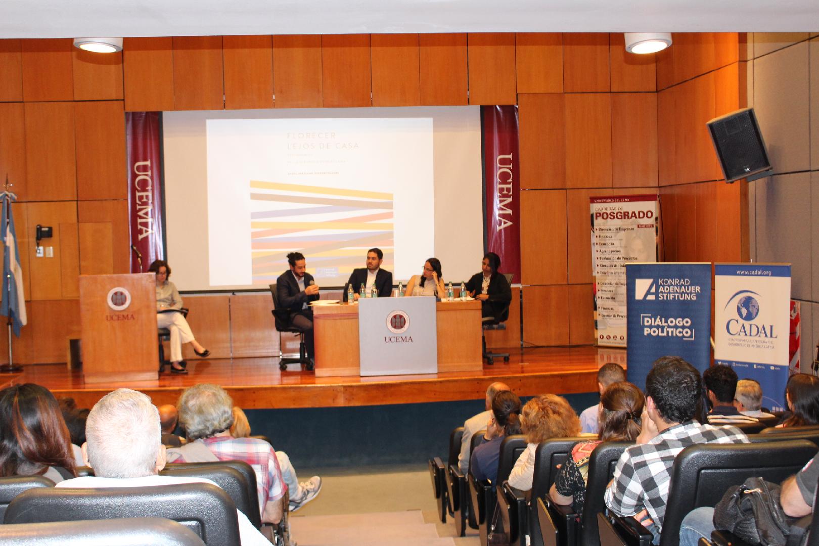La Dra. Sybil Rhodes, presidenta del Centro para la Apertura y el Desarrollo de América Latina (Cadal), organización que apoyó activamente la organización de este evento, y profesora de la Universidad del CEMA, expuso comentarios en torno a la lectura del libro y señaló la originalidad e importancia del documento que registra el momento que viven los ciudadanos venezolanos en el mundo. De igual forma, moderó el espacio en el que los autores invitados participaron hablando desde su experiencia como escritores miembros del compilado “Florecer lejos de casa”. Estos fueron Ángel Arellano, coordinador editorial del libro, coordinador de proyectos de la KAS Montevideo y ciudadano venezolano residente en Uruguay; Tamara Taraciuk, abogada venezolana-argentina relatora de la ONG Human Rights Watch (HRW); Paola Soto, periodista, poeta y escritora venezolana residente en Argentina; y Hensli Rahn, licenciado en letras y escritor venezolano residenciado en Berlín, Alemania.