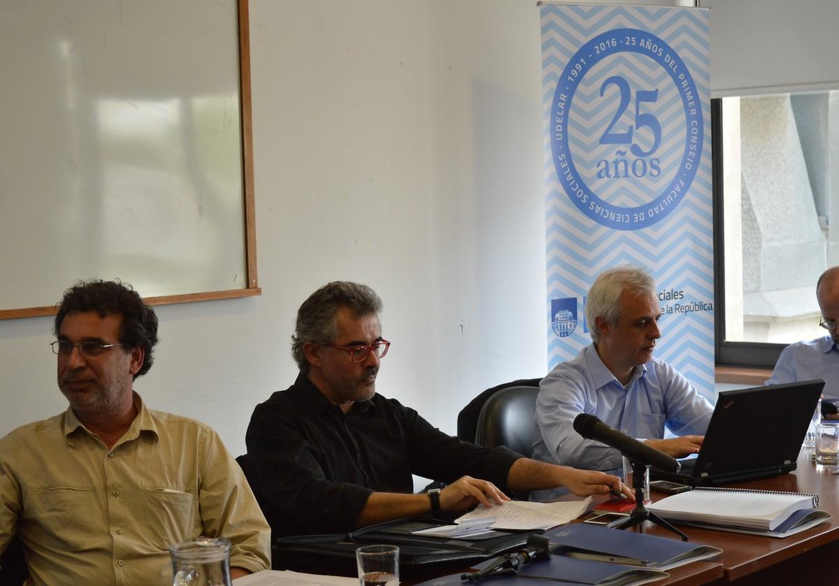 “Incorporar el componente conflictivo en la toma de decisiones”, constituye un desafío ineludible, anotaba el Dr. Javier Rodríguez Weber (profesor de Historia y doctor en Historia Económica, FCS), quien junto al Dr. Fernando Filgueira (sociólogo, consultor) y el Mag. Gustavo De Armas (sociólogo y politólogo, Unicef) comentaron el trabajo. La jornada culminó con una mesa integrada por la Dra. Ester Mancebo, encargada de la Dirección del Instituto de Ciencia Política - FCS-UDELAR y el Prof. Dr. Pablo de Silveira (Universidad Católica del Uruguay).