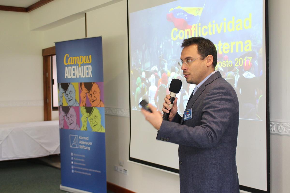 Miguel Ángel Martínez expuso los temas “La crisis venezolana en la actualidad” y “El rol de la comunidad internacional ante la crisis venezolana”, durante su intervención consideró algunos elementos para analizar la inestabilidad del sistema político en el país: la muerte de Hugo Chávez y la falta de dirección dentro del partido de gobierno; y la caída del precio de barril de petróleo (deuda pública supera los 140 millones de dólares, descenso del PBI a más del 30%, la mortalidad infantil creció un 30% del 2015 al 2016, la mortalidad materna un 65% durante el mismo periodo, la segunda tasa mayor de homicidios en el planeta, el paupérrimo salario mínimo, presos políticos, entre otros puntos. Martínez propone los siguientes elementos para apoyar, desde la comunidad internacional, la reconstrucción democrática del país: