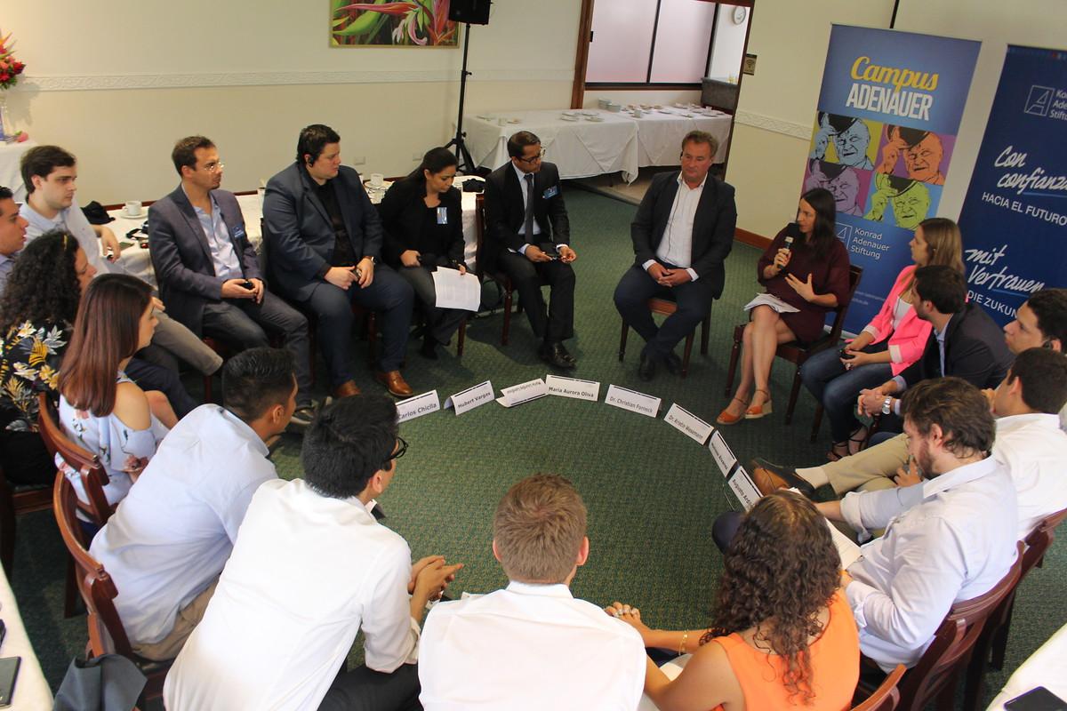 La bienvenida estuvo a cargo de la Dra. Kristin Wesemann, directora del Programa Regional de Partidos Políticos y Democracia en América Latina, y del Dr. Werner Böhler, representante para Costa Rica y Panamá de la Fundación Konrad Adenauer. Las conferencias fueron dictadas por el Dr. Christian Forneck, asesor parlamentario de la CDU/CSU sobre política exterior de Alemania, y el Dr. Miguel Ángel Martínez, profesor venezolano de ciencias políticas de la Universidad Austral de Chile. Al evento asistieron 15 jóvenes de 13 países de América Latina que también expusieron los lineamientos de política exterior de sus partidos políticos