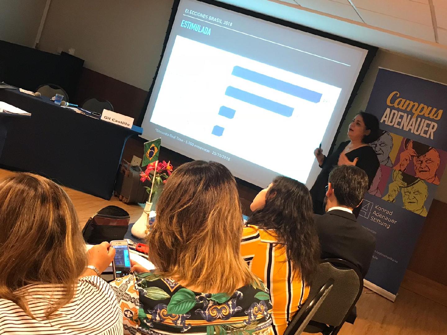 La conferencia de la consultora Gil Castillo titulada “Las claves de la campaña presidencial 2018 en Brasil”. Castillo tiene experiencia tanto en Brasil con candidatos de centro y en Mozambique donde asesora un partido pacifista de tercera vía. Su conferencia fue una retrospectiva de la historia reciente de la historia política del país desde las manifestaciones de 2013, pasando por el Impeachment de Dilma y explicando el sentimiento de odio contra el PT hasta el fenómeno Bolsonaro. La consultora también expuso las principales herramientas de la campaña política de los candidatos del balotaje.